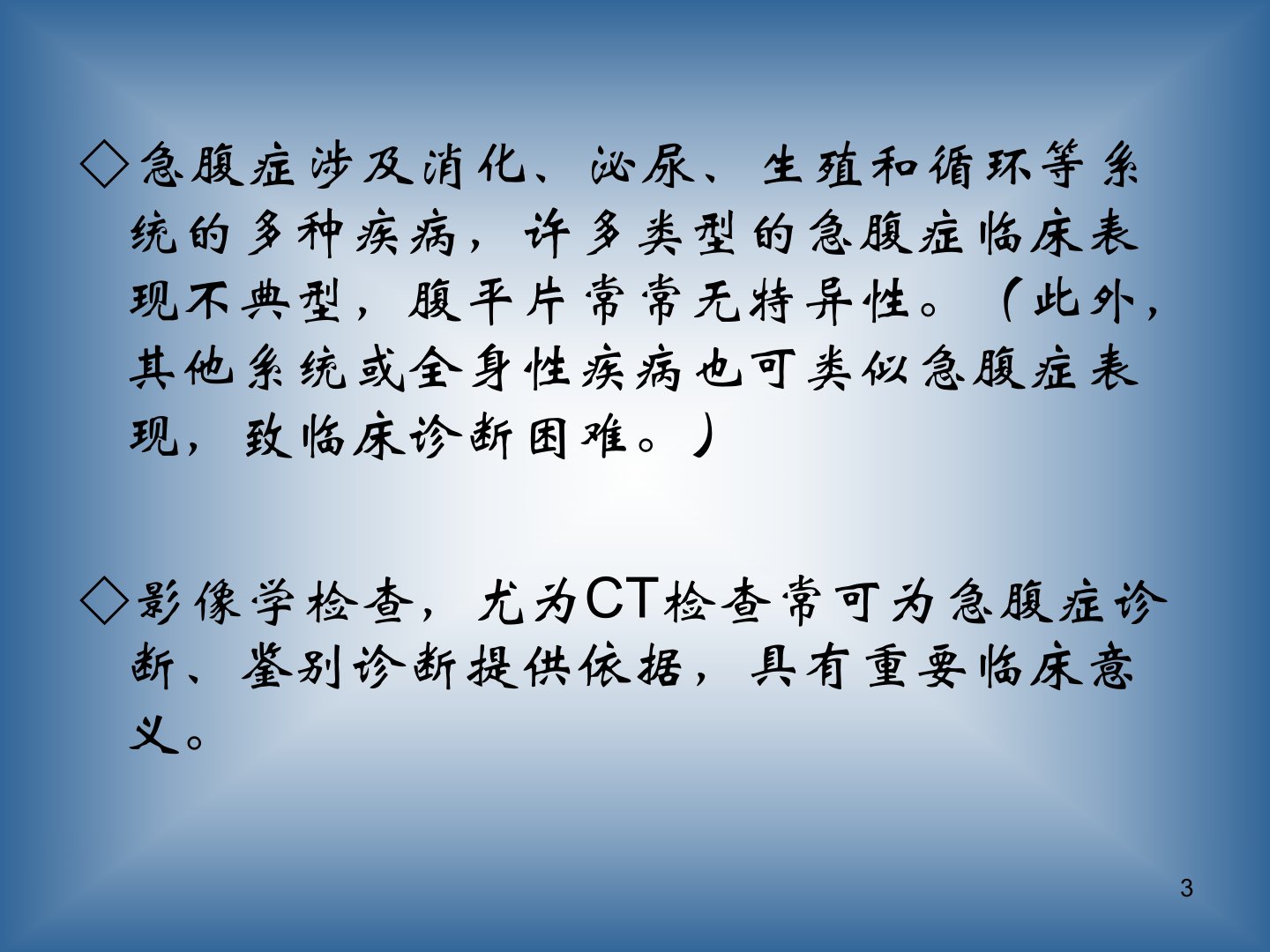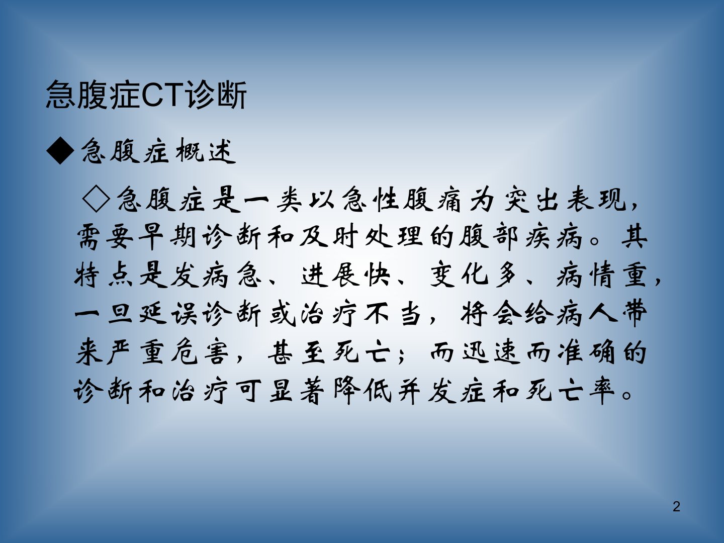 急腹症是一类以急性腹痛为突出表现的腹部疾病发病急、进展快、变化多、病情重延误诊断或治疗不当会带来严重危害。影像学检查中CT检查可为急腹症诊断、鉴别诊断提供重要依据。急腹症CT诊断常见病因涉及多系统:胃肠道疾病方面如胃肠道穿孔常继发于溃疡、创伤和肿瘤CT可见腹腔游离气体、积液等;急性阑尾炎CT可见阑尾增粗、壁增厚等穿孔时有特征性征象;小肠或结肠梗阻可见肠管扩张积气、气液平面等肠系膜扭转有“漩涡样”改变。肝胆胰脾疾病方面实质脏器外伤可见包膜下血肿等;急性胆囊炎CT可见胆囊增大、壁增厚等;胆系结石可见胆囊内等高密度影;急性胰腺炎CT分水肿型和坏死型表现不同。泌尿系统病变如泌尿系结石可见肾盂等部位致密影。血管性病变如肠系膜血管栓塞增强检查肠系膜血管不强化等;主动脉瘤及并发症增强检查可见瘤体等。
