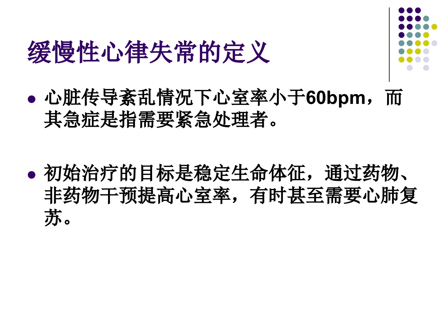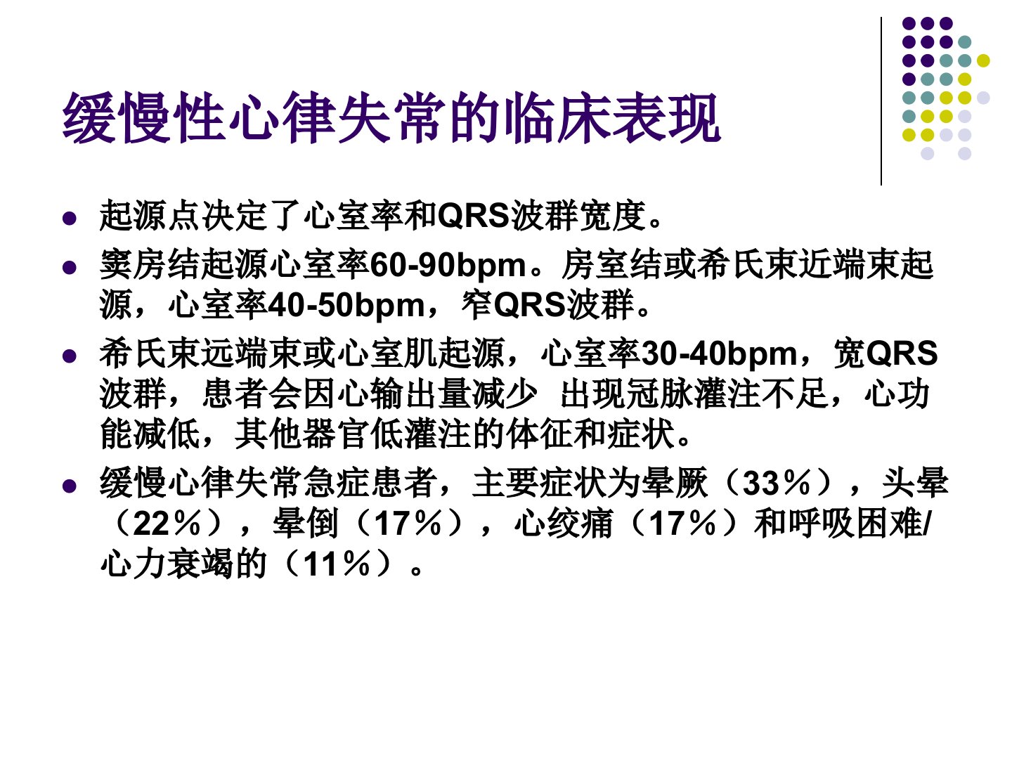 缓慢性心律失常指心脏传导紊乱下心室率小于60bpm的急症需紧急处理目标是稳定生命体征提高心室率。其临床表现因起源点不同而异患者会因心输出量减少出现冠脉灌注不足、心功能减低等体征和症状主要症状包括晕厥、头晕等。心电图特征主要分为窦房结功能障碍、房室传导阻滞和束支阻滞三种类型。其中病态窦房结综合征是由于窦房结自律性或传导功能低下而呈现临床症状的综合征根据Ruhenstein的分类可分为三型。房室传导阻滞是指从心房向心室的兴奋传导发生延迟或阻断的状态I度不伴有QRS波脱落II度包括文氏型和莫氏型高度及完全性房室传导阻滞的确切疗法是起搏。对于缓慢性心律失常急诊应评估血液动力学稳定性等病理性心动过缓病因分为内在和外在治疗上不稳定心动过缓患者可用阿托品等药物无效的危重患者需心脏起搏治疗。