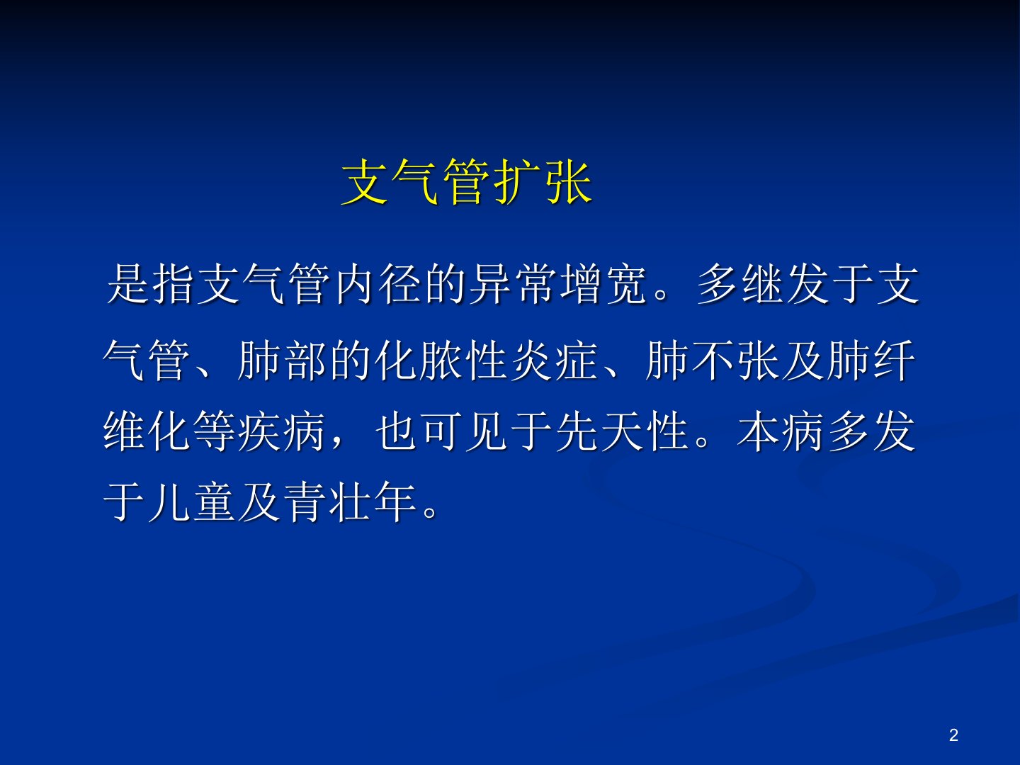 呼吸系统常见疾病X线表现支气管扩张是指支气管内径的异常增宽。多继发于支气管、肺部的化脓性炎症、肺不张及肺纤维化等疾病,也可见于先天性。本病多发于儿童及青壮年。1.先天性支气管扩张2.后天性支气管扩张支气管管腔的阻塞支气管本身的化脓性炎症引起支气管壁弹性组织的破坏外力(如肺不张及肺纤维化)对支气管壁产生外在性的牵拉三、X线表现肺纹理增多、增粗紊乱,呈网状、蜂窝状在增多紊乱的肺纹理中可见片状、大片状模糊影四、CT表现柱状支气管扩张囊状支气管扩张混合型支气管扩张柱状支气管扩张囊状支气管扩张混合型支气管扩张肺部炎症一、大叶性肺炎(一)致病菌:多为肺炎双球菌或链球菌(二)临床表现:起病急,以突然高热、寒...