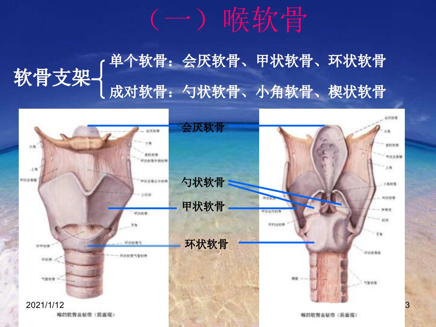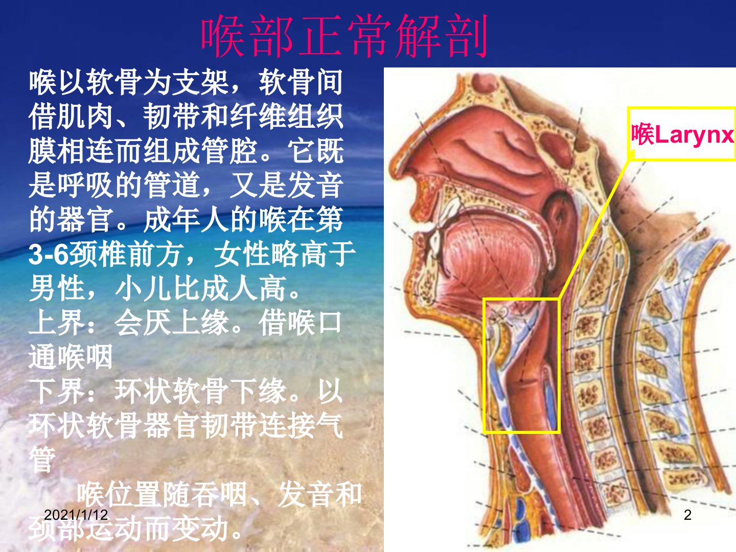 喉部解剖及常见疾病CT诊断摘要喉部以软骨为支架通过肌肉、韧带和纤维组织膜相连形成管腔既是呼吸管道也是发音器官。喉软骨包括会厌软骨、甲状软骨、环状软骨等单个软骨以及勺状软骨、小角软骨、楔状软骨等成对软骨。喉连接结构包括环甲膜、方形膜和弹性圆锥等。喉间隙包括会厌前间隙和声门旁间隙喉腔分为喉前庭、喉中间腔和声门下腔。影像诊断学上喉腔划分为声门上区、声门区和声门下区。喉部常见疾病包括急性喉炎、喉外伤、喉异物、喉息肉、喉囊肿、喉乳头状瘤和喉癌等。喉息肉多发生于声带前、中13结合部CT表现为带蒂或宽基底的软组织密度影;喉囊肿多因喉室发育不良等引起CT表现为会厌区半圆形囊状低密度区;喉乳头状瘤多由HPV病毒感染所致CT表现为边界清楚的软组织肿块影;喉癌多见于5070岁男性病理上以鳞状细胞癌最常见CT表现因类型而异但多表现为喉腔内软组织肿块和喉软骨破坏。