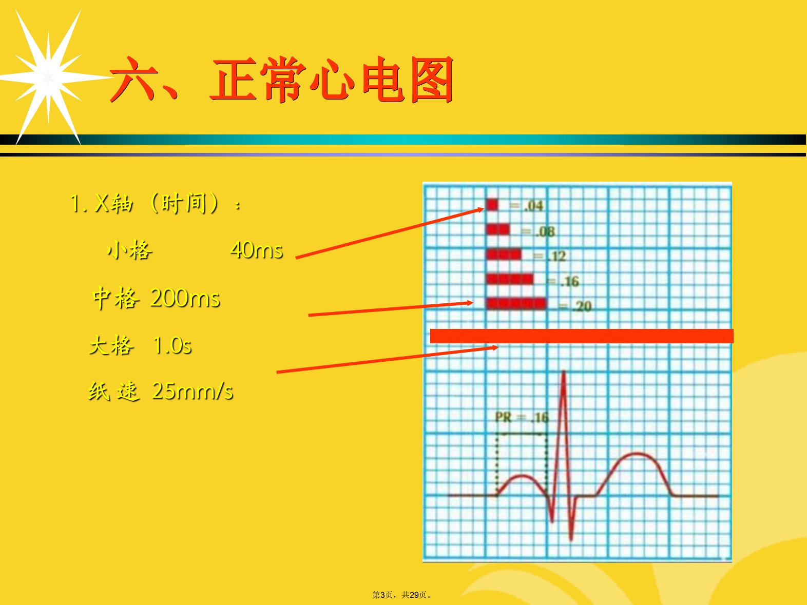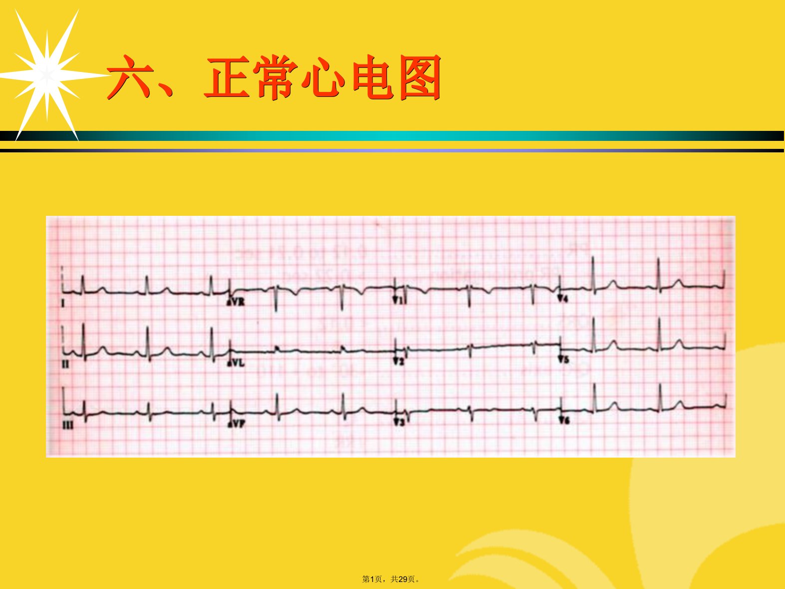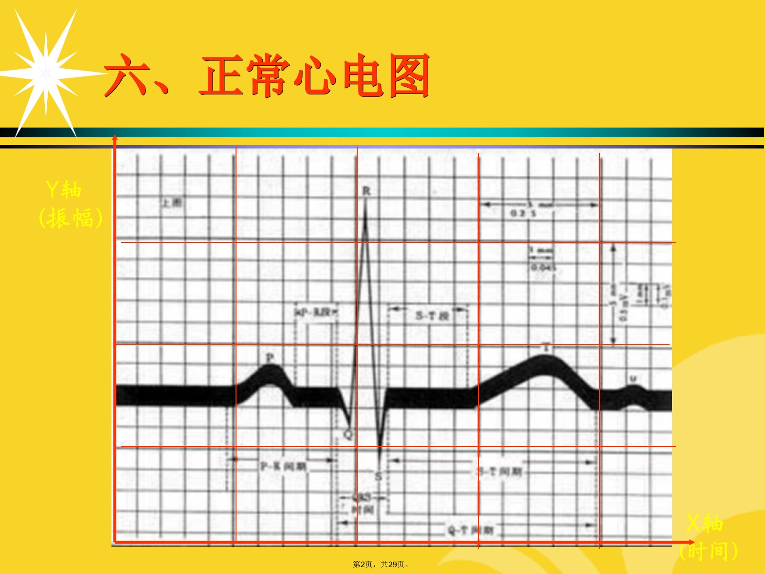 正常心电图中X轴代表时间小格为40ms中格200ms大格10s纸速通常为25mms;Y轴代表电压小格01mV中格05mV2个中格为10mV标准电压为10mm对应1mV。心电图由P波、QRS波群、T波及(U波)等基本波形组成分别代表心房除极、心室除极、心室复极等过程。其中P波形态小而圆QRS波群高而尖T波大而圆钝。心电轴代表除极或复极过程电动力总趋势分为额面电轴与水平面电轴其中额面电轴正常范围为090对分支阻滞敏感;水平面电轴则与心室横切面平行对心室肥大敏感。心电图诊断步骤包括判断主导心律、测量心电轴、识别病理心电图并得出结论。医生需掌握心电图导联、分类、特殊传导系统等基础知识理解心电图记录原理以准确诊断。