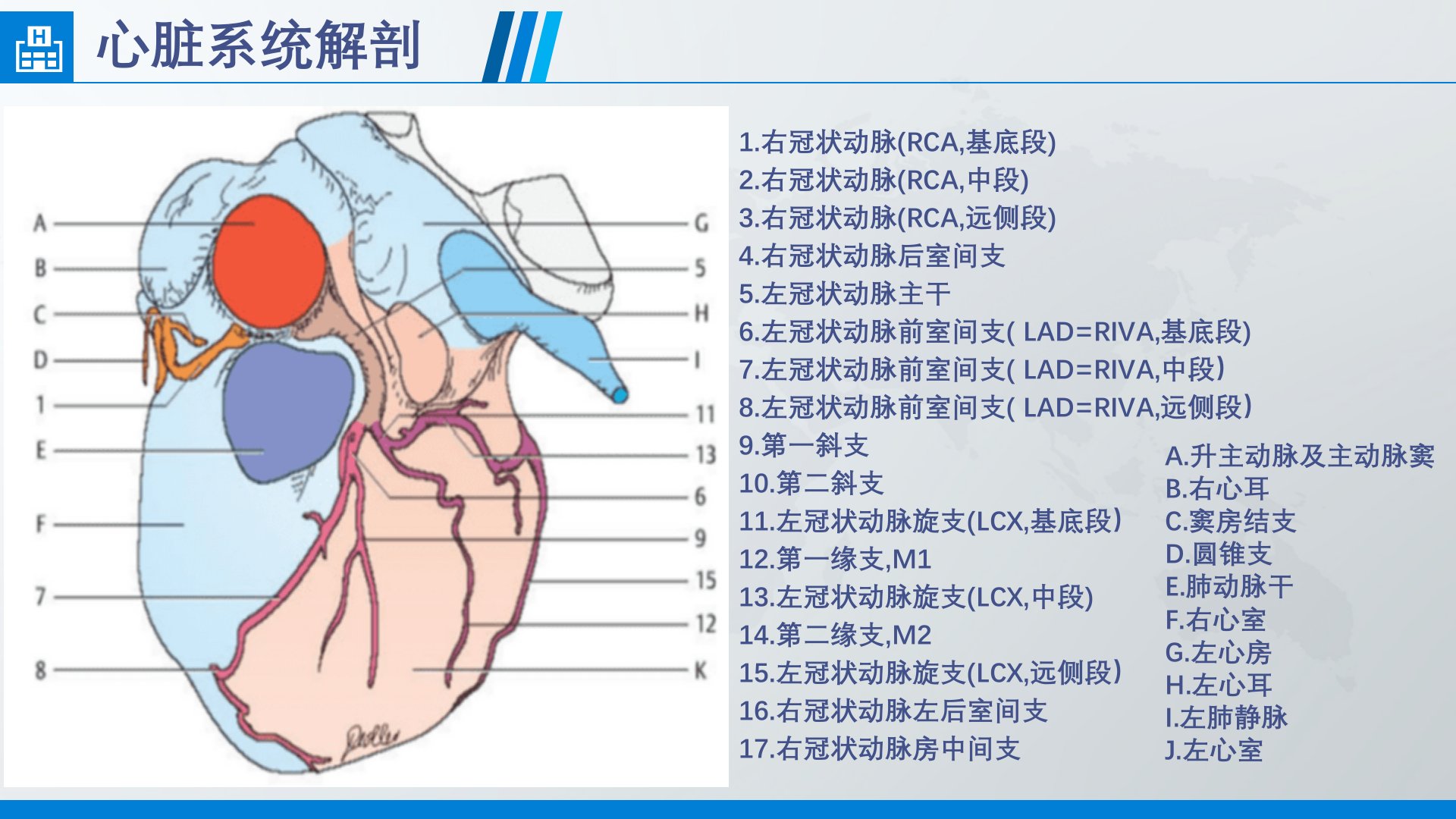 摘要本文详细介绍了冠状动脉CTA的解剖结构、发育异常及常见病变的诊断方法。一、心脏与冠状动脉解剖心脏系统解剖:涵盖右冠状动脉、左冠状动脉及其分支的详细分段。冠状动脉分支解剖:细述了左右冠状动脉的各个分段及其主要分支包括前降支、旋支等。左、右冠状动脉及其分支:左冠状动脉主干起自左后窦分为前降支和左旋支供应左心室前壁等区域。右冠状动脉则起自主动脉前窦供应右心室前壁等区域。二、冠状动脉分布类型右优势型:右冠状动脉在心室膈面分布范围大。均衡型:左心室后壁由左回旋支供血室间隔下13由右冠状动脉供血。左优势型:左冠状动脉有较粗大的回旋支发出左室后支等。三、冠状动脉分段根据美国心脏协会建议冠状动脉分为15段包括右冠状动脉近段、中段、远段等。四、冠状动脉发育异常起源异常:如高位起源、多个开口、单一冠状动脉、冠状动脉异位起于肺动脉等。走行异常:如心肌桥、贴壁血管和重复冠状动脉。终止异常:如冠状动脉瘘、冠状动脉弓等。五、常见病例冠状动脉钙化:动脉粥样硬化的表现形式之一。冠状动脉狭窄:根据狭窄程度分级金标准为有创性的冠状动脉造影。
