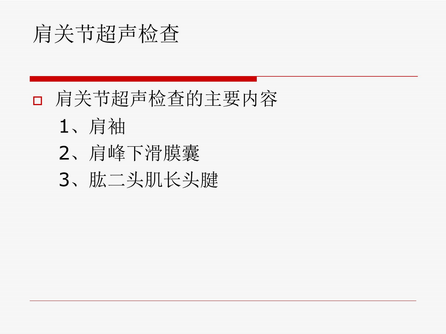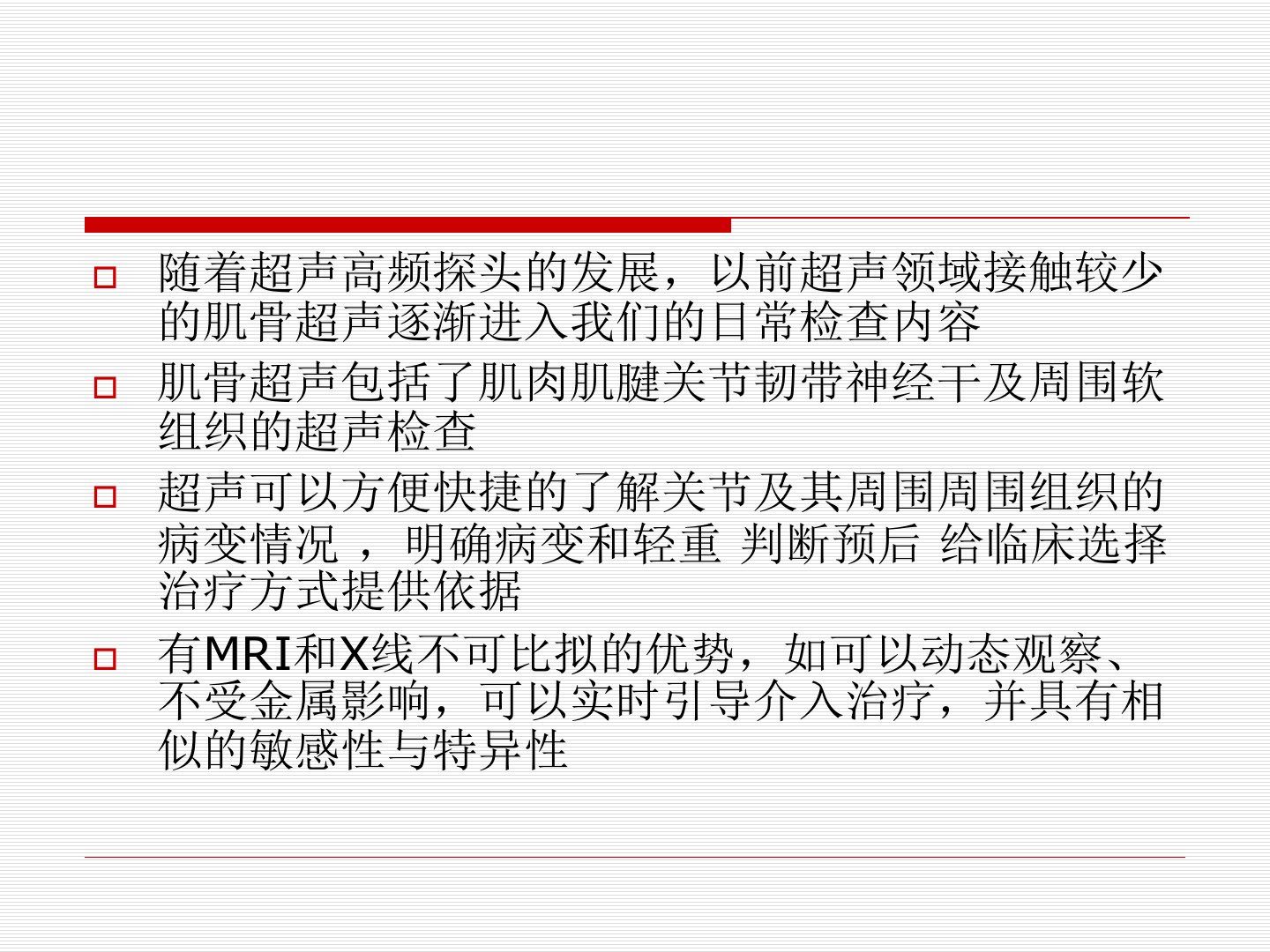 内江市中医医院功能科兰斌指出随着超声高频探头发展肌骨超声逐渐成为日常检查内容可了解关节及周围组织病变为临床治疗提供依据且具有动态观察、不受金属影响、可实时引导介入治疗等优势。肩关节超声检查中肩胛下肌腱附着于肱骨小结节冈上肌腱80以上损伤发生于此检查需注重扫查全;肌腱厚度、回声异常等可考虑诊断肌腱炎;肩峰撞击试验可判断肩峰撞击综合征。肩袖损伤主要发生于冈上肌腱和肩胛下肌腱可通过纵横切观察肌腱连续性等判断。伸肌总腱、屈肌总腱等异常可提示相应病症。腕管由腕骨和腕横韧带构成内含肌腱和神经。髌上滑膜囊、滑膜性软骨瘤病、鹅足腱滑囊积液等病症各有超声表现。膝关节半月板、髌韧带等也有特定检查方法和超声特征。此外髋关节发育不良、髋关节积液、踝部扭伤等病症也均可通过超声检查辅助诊断。