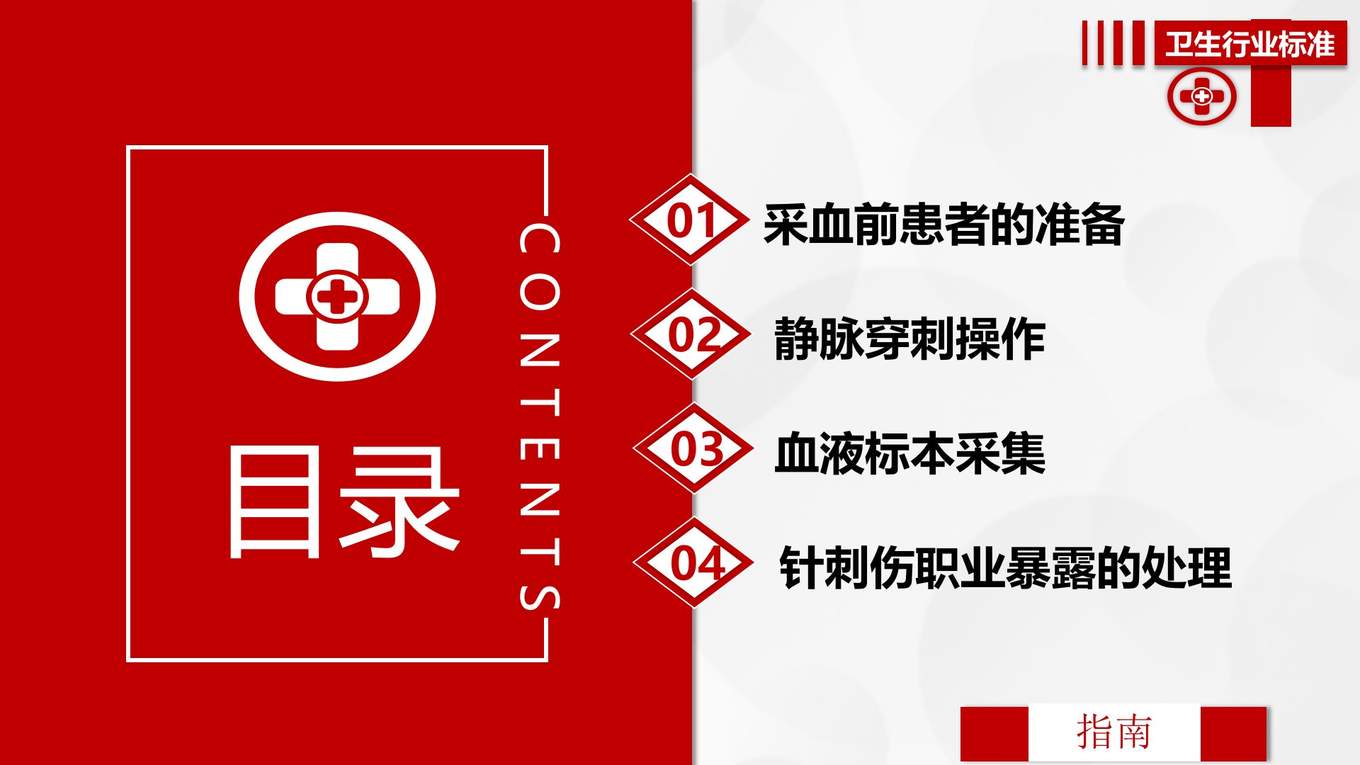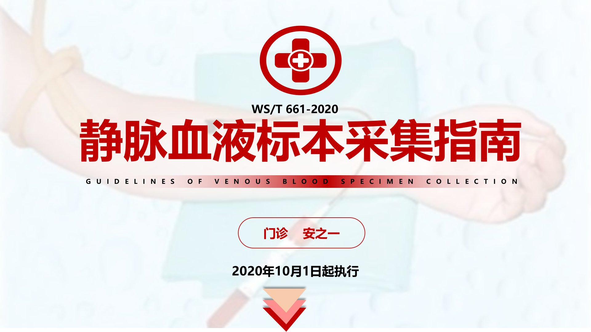 《静脉血液标本采集指南》摘要《静脉血液标本采集指南》(WST6612020)自2020年10月1日起执行涉及静脉穿刺操作、血液标本采集、针刺伤职业暴露处理等多方面。采血前患者准备:空腹采血需禁食816h宜上午79点采期间可少量饮水;24h内不宜饮酒。采血前24h不宜剧烈运动当天避免情绪激动宜静息至少5min。不同检测项目采血时间有特殊要求如血培养、促肾上腺皮质激素等。门诊患者坐位、病房患者卧位采血体位影响检测结果时应遵医嘱。输液结束3h后采血特殊情况在输液对侧肢体或同侧肢体输液点远端采血。静脉穿刺操作:坐位采血时患者侧身坐卧位采血时仰卧充分暴露采血部位。首选手臂肘前区静脉特殊情况可选其他部位。绑扎止血带不宜超1min穿刺时让患者攥拳成功后放松。消毒以穿刺点为圆心范围直径5cm消毒2次。血液标本采集:不同采血管有采集顺序特殊情况有注意事项。血液标本无法正常采集时可轻微调整进针位置。疑似动脉、神经损伤应立即终止采血并处理。患者晕厥要立即停止采血进行应急处理。预防标本溶血要注意消毒干燥、轻柔混匀等。拔针后按压穿刺点5min。针刺伤职业暴露处理:被锐器刺伤后立即挤出污血、冲洗消毒包扎伤口报告并