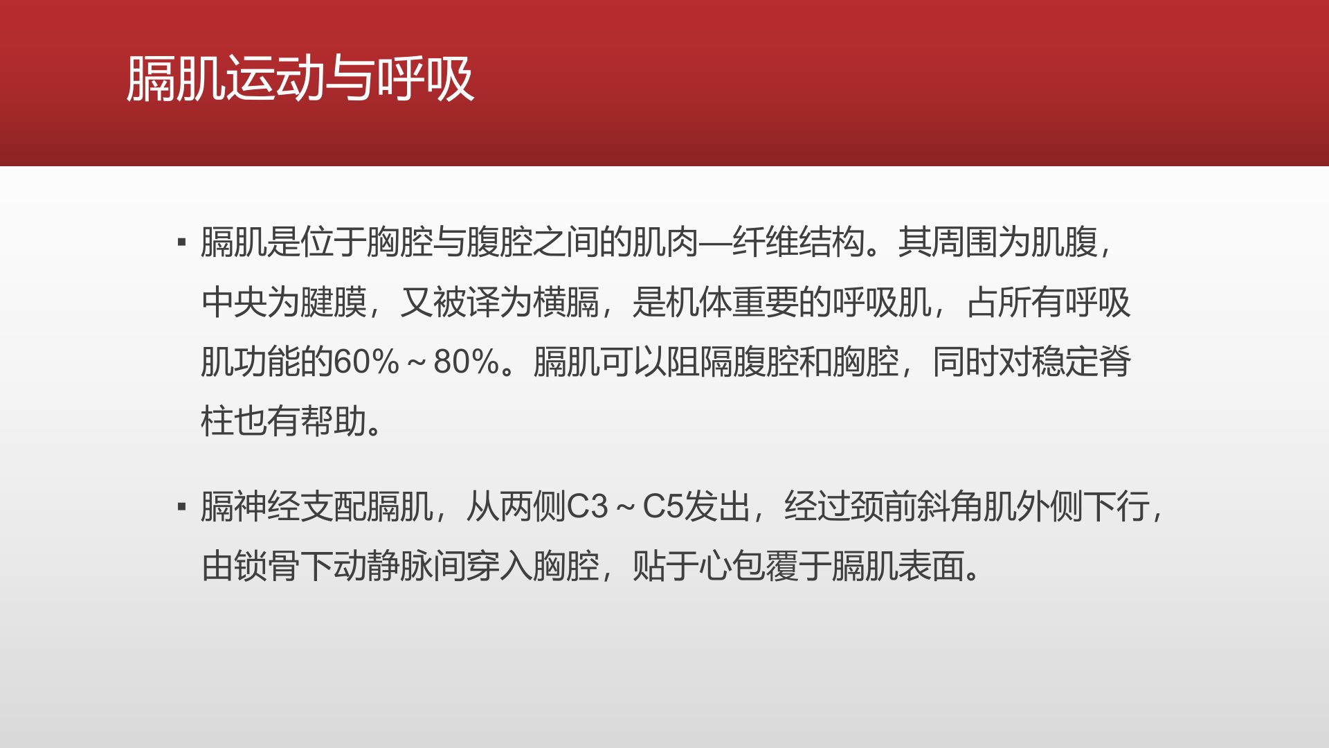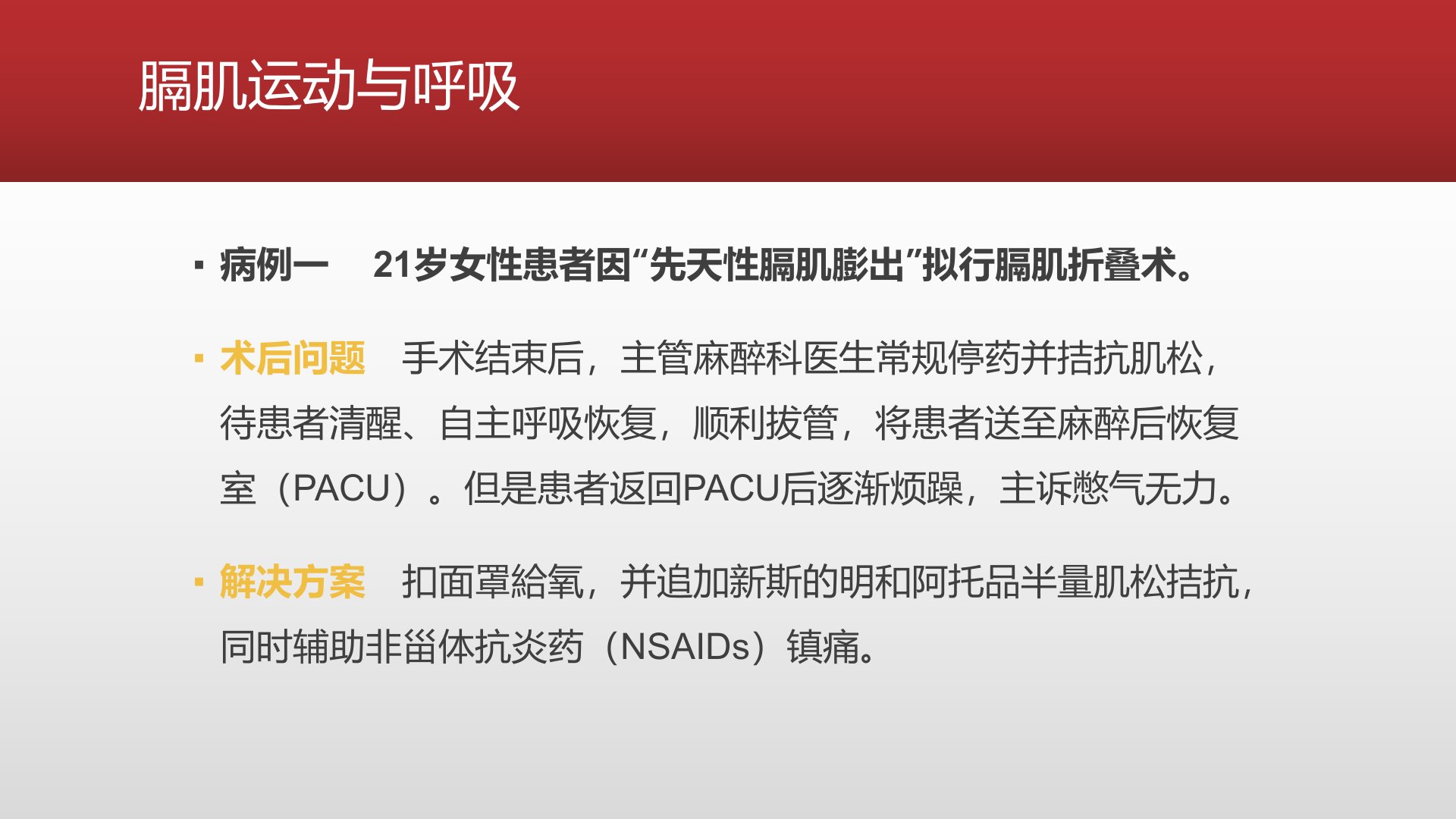 膈肌超声与呼吸管理摘要膈肌位于胸腔与腹腔之间是重要的呼吸肌占所有呼吸肌功能的6080由膈神经支配。文中通过两个病例展示了膈肌运动与呼吸管理的关系:病例一为21岁女性先天性膈肌膨出患者术后出现呼吸问题讨论认为可能与膈肌折叠术后造成肌肉或神经功能损伤有关可用超声鉴别诊断;病例二为32岁肥胖女性肱骨上段骨折患者在超声引导下行锁骨上臂丛神经阻滞术后出现呼吸问题讨论认为不能排除锁骨上臂丛神经阻滞导致膈神经阻滞影响呼吸功能的可能。研究表明超声可准确、安全、无创评估膈肌结构和功能主要通过观察膈肌厚度及变化、膈肌运动及其变化情况预判膈肌功能。膈肌厚度正常值在226cm厚度变化率等指标可提示膈肌功能。膈肌超声还可用于判断肺功能、COPD患者康复情况、围术期患者呼吸情况、预测残余肌松及术后肺部并发症等。膈肌超声在围术期运用广泛掌握该技术对麻醉科医生围术期呼吸管理尤为重要。