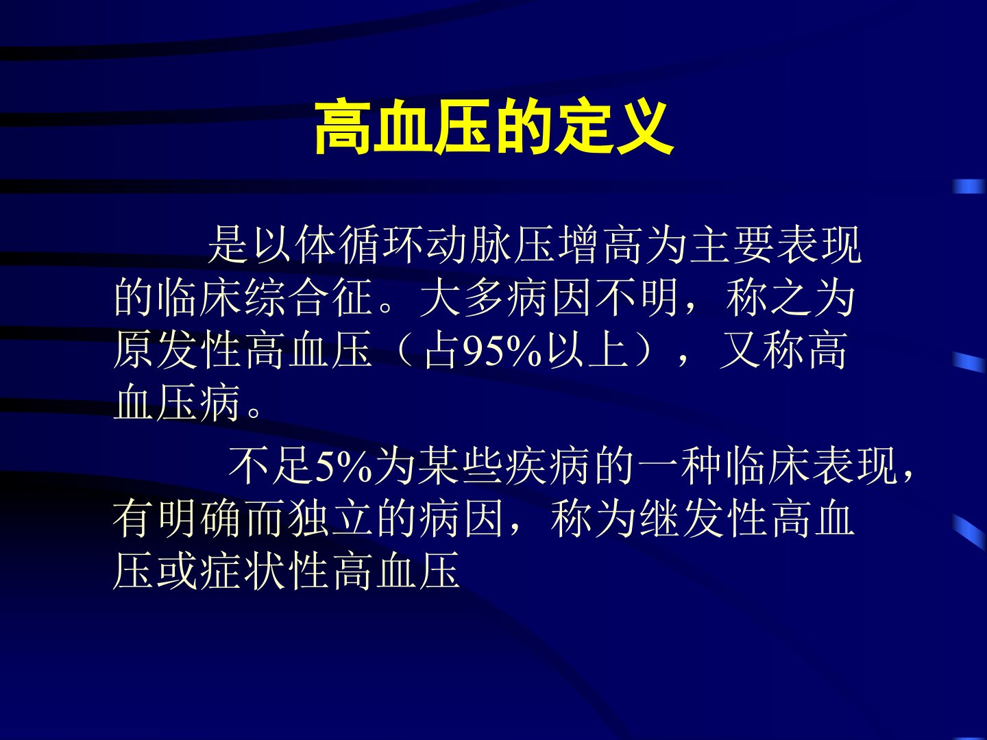 高血压是以体循环动脉压增高为主的临床综合征大多病因不明称为原发性高血压占比95以上。其诊断考虑危险度分层、危险因素和病史。动态血压监测可揭示高血压昼夜变化双峰一谷的节律对预测心脑肾靶器官的并发症及评价降压药疗效有重要作用。原发性高血压常见病因包括家族遗传、膳食高钠低钾、精神应激和肥胖等;继发性高血压则多由肾脏疾病、内分泌疾病、药物因素等引发。高血压若不控制可能导致心、脑、肾等器官的损害。降压治疗目标为14090mmHg药物选择需考虑患者具体情况从小剂量开始逐步递增最好使用长效降压药可采用联合治疗方案。动态血压监测具有轻巧、安全、操作简便等优点可补充常规随测血压的不足。