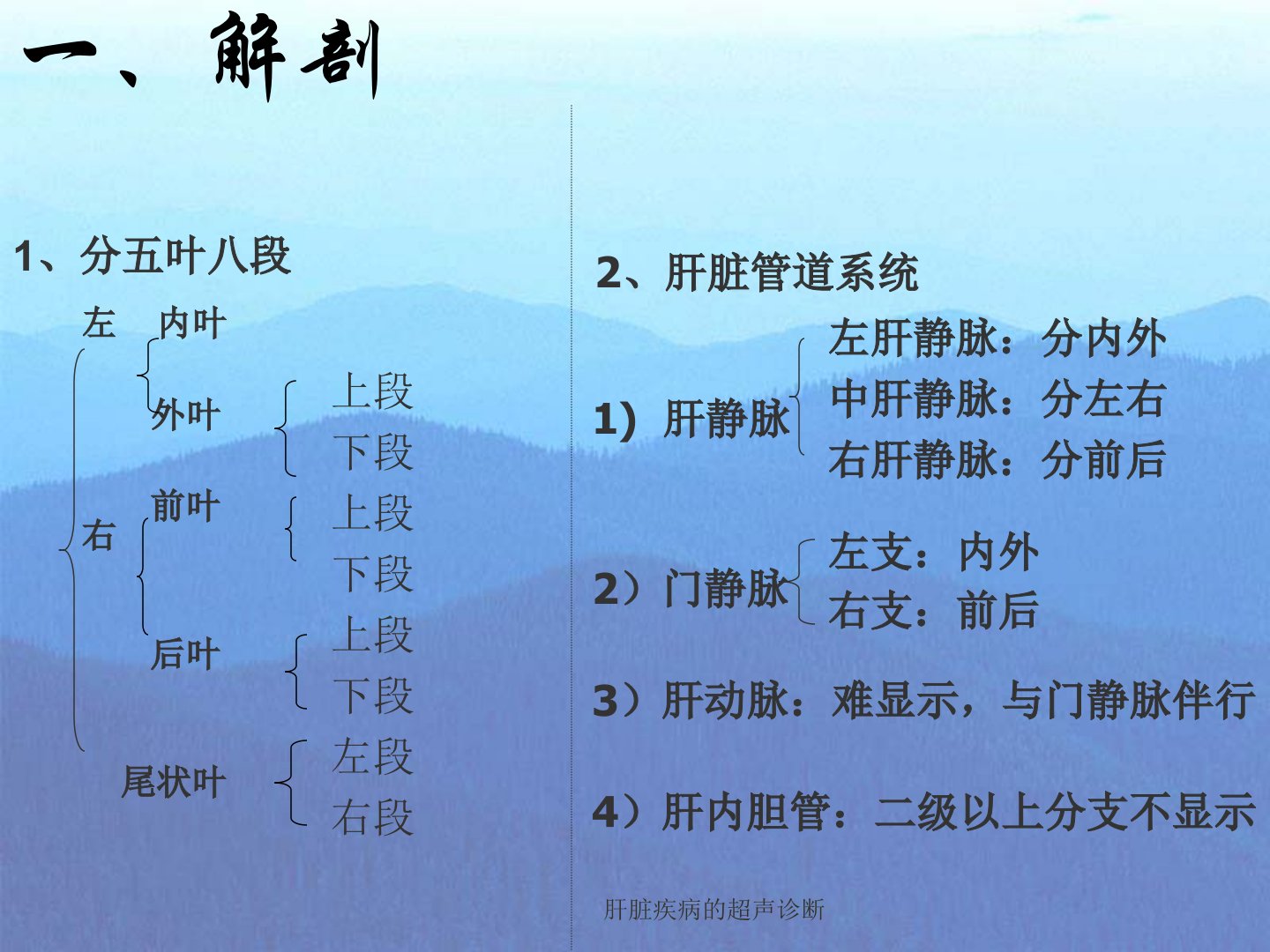 肝脏疾病的超声诊断摘要本文围绕肝脏疾病的超声诊断展开涵盖多方面内容。首先介绍肝脏解剖包括分五叶八段、肝脏管道系统(肝静脉、门静脉等)、肝分两面、肝内血供及各肝门构成。正常切面图方面展示了肝静脉、门静脉等显像及CDFI表现。诊断分析要点强调物理形态学诊断需关注肝脏形态、大小、包膜、内部结构回声、CDFI等情况并结合病史等综合分析。同时指出肝胆超声误、漏诊常见因素如超声局限性、盲区、仪器、经验及相关学科知识等并提出相应对策。此外探讨几个有争议的问题涉及非均质性脂肪肝、门脉高压症诊断标准等。最后列举肝脏常见疾病包括感染性疾病(肝炎、肝脓肿等)、肿瘤(肝囊性病变、肝实质性肿瘤等)、先天发育异常(形态、位置异常等)及其他疾病(脂肪肝、淤血肝等)。
