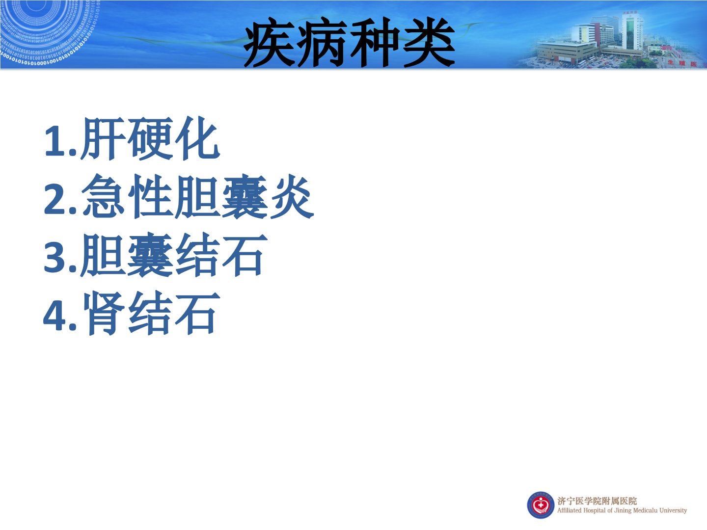 本文介绍了腹部常见疾病的超声诊断重点涵盖肝硬化、胆囊结石、急性胆囊炎及肾结石。肝硬化是常见慢性肝病灰阶超声下典型表现为肝左右叶缩小或左叶代偿性增大肝包膜锯齿状肝区回声增粗增强血管纹理紊乱脾大、腹水等;彩色多普勒可见门静脉扩张、血流速度降低肝动脉流速及RI增高肝静脉变细等。胆囊位于肝右叶胆囊窝内胆囊结石典型声像图为胆囊内强回声伴声影可随体位移动泥沙样结石则表现为胆囊后壁强回声带伴声影。急性胆囊炎多由结石嵌顿引起声像图表现为胆囊肿大、壁增厚、胆汁浑浊。肾结石超声表现为肾窦内强回声伴声影含钙结石声影显著CDFI检查可见快闪伪像超声对0305cm以上肾结石敏感性高达96。