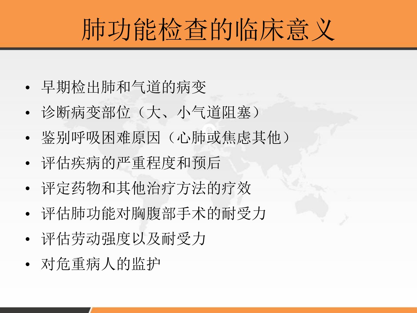 肺功能检查及临床应用摘要肺功能检查意义重大可早期检出肺和气道病变诊断病变部位鉴别呼吸困难原因评估疾病严重程度、预后、疗效、手术耐受力、劳动强度及耐受力还能用于危重病人监护。检查内容包括通气功能检查、支气管舒张试验、支气管激发试验、强迫振荡肺功能检查等。通气功能检查用于呼吸功能评价、疾病诊断评估等有绝对和相对禁忌症;支气管激发试验适用于疑诊哮喘等情况也有绝对和相对禁忌症检查前需停用特定药物;支气管舒张试验用于合并气道痉挛等疾病有相应禁忌症和注意事项;脉冲强迫振荡适应症广泛可静态评估、确定肺功能等在哮喘和COPD方面有重要应用。肺功能检查申请分门诊和住院需与肺功能室预约优先满足门诊患者检查时间与患者配合及项目多少有关约3060分钟。