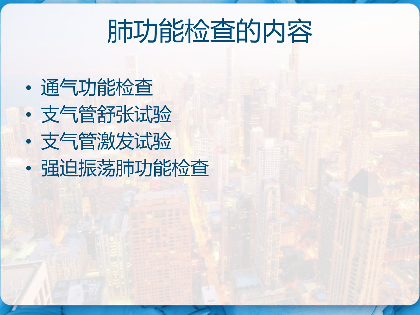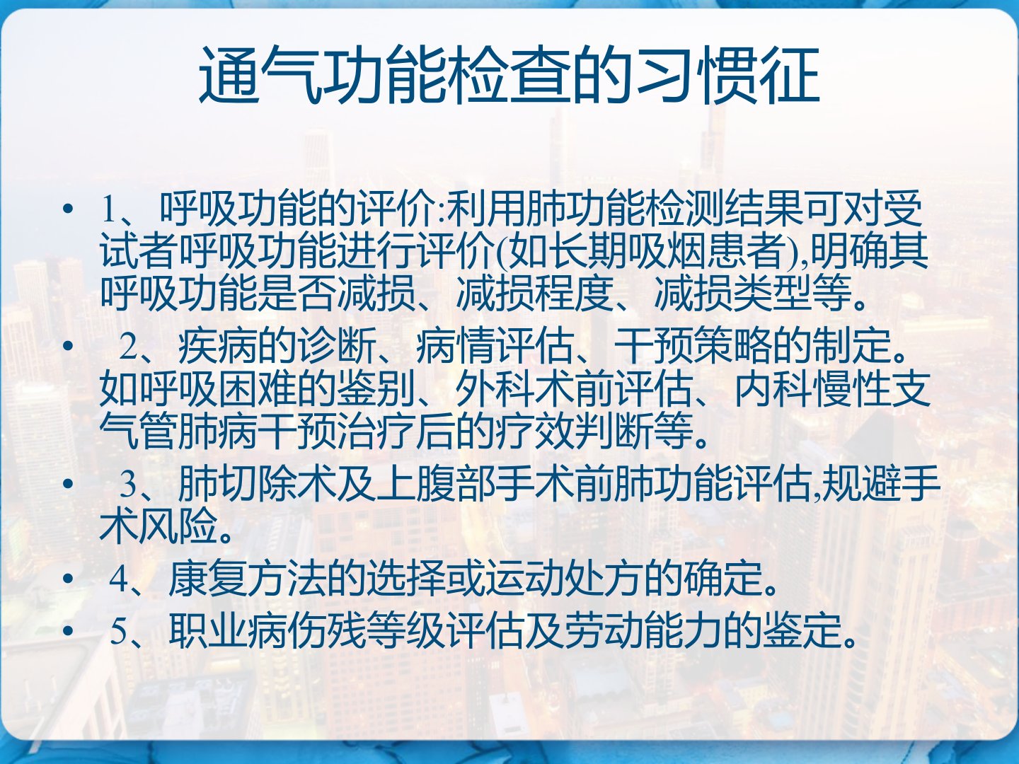 肺功能检查涵盖通气功能检查、支气管舒张试验、支气管激发试验及强迫振荡肺功能检查。其临床应用广泛包括评价呼吸功能如评估长期吸烟者呼吸功能减损情况;辅助疾病诊断、病情评估及干预策略制定如鉴别呼吸困难、评估外科术前风险及内科慢性支气管肺病疗效;规避手术风险如肺切除术及上腹部手术前评估;选择康复方法或确定运动处方;以及评估职业病伤残等级及劳动能力。检查有绝对及相对禁忌症如心肌梗死、休克等为绝对禁忌心率过快、气胸等为相对禁忌。支气管激发试验主要用于哮喘诊断、鉴别及评估也有相应禁忌。支气管舒张试验适用于合并气道痉挛疾病有禁忌及注意事项。脉冲强迫振荡可静态评估确定肺功能及测定气道阻力在哮喘和COPD方面有特定应用。肺功能检查有门诊和住院两种申请方式。