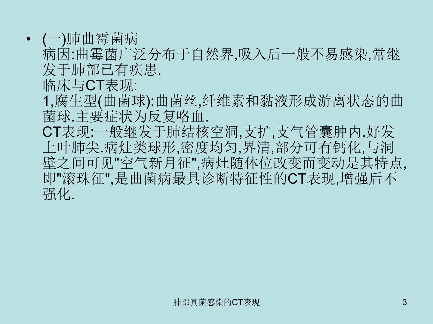 肺真菌感染指真菌侵犯气管、支气管和肺引发炎症肉芽肿严重者有坏死性肺炎甚至血行播散以念珠菌、曲菌最常见。其CT表现多样:肺曲霉菌病:腐生型曲菌球好发于上叶肺尖病灶类球形有空气新月征、滚珠征增强后不强化;侵袭型表现为大片致密影、结节团块影伴晕征增强后轻度强化还可见空洞及空气新月征;变态反应性支气管肺型有一过性游走性肺部浸润影、支气管壁增厚等表现。肺隐球菌病:CT表现多态多样多病灶如结节肿块、浸润实变灶、空洞等需与肺癌、转移癌、结核鉴别。肺念珠菌病:CT表现为多发边界清楚的结节伴实变、树芽征等缺乏特异性。肺组织孢浆菌病:影像表现因类型而异急性肺型为弥漫性结节状阴影或片状实变影易误诊为肺结核。肺孢子菌病:CT表现为肺泡浸润、斑片状实变影、间质病变等需与其他肺部机遇感染鉴别。