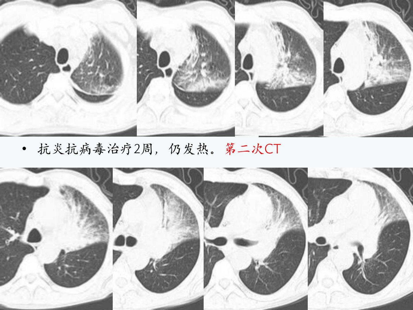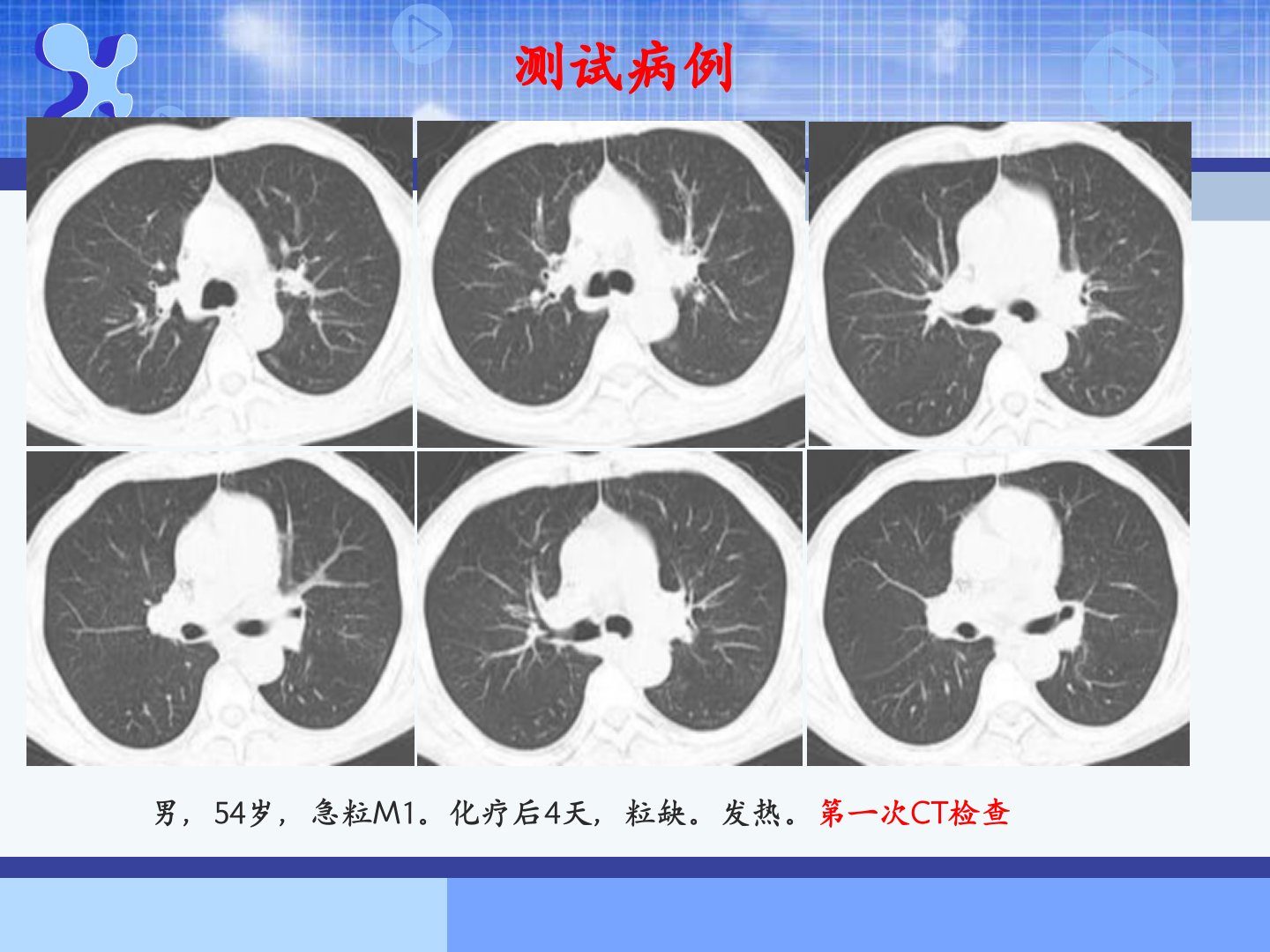 54岁男性急性粒细胞白血病M1型患者化疗后粒缺发热经抗炎抗病毒治疗无效。CT复查结合纤支镜病理确诊为侵袭性支气管曲菌病。曲霉菌病是真菌感染中最常见的一种急性白血病患者发病率高误诊病死率高常见于免疫力低下、长期使用广谱抗生素等人群。诊断标准包括宿主因素、临床特征、病原菌检测等。肺曲菌病根据宿主免疫反应分为寄生性、过敏性、半侵袭性、侵袭性4种类型。侵袭性曲菌病是最常见的机遇性肺部真菌感染影像表现为早期胸膜下密度增高结节实变影后出现晕轮征1015天后出现空洞或新月征。血管侵袭性曲菌病表现为伴有晕征的小结节影抗真菌治疗后空洞形成“空气半月征”;气道侵袭性曲菌病占侵袭性肺曲菌病的1030病理为小气道壁液化坏死及中性粒细胞浸润分为气管支气管炎型、细支气管炎型、支气管肺炎型。肺部曲菌病类型与机体免疫状态有关CT表现有差异典型表现者可准确诊断不典型者需结合临床或病理确诊。