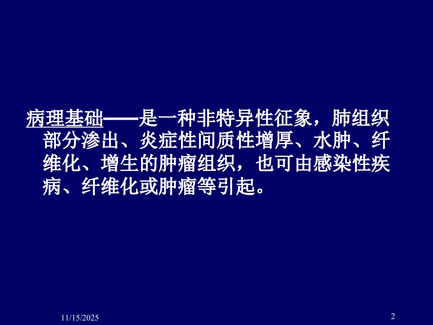 肺部磨玻璃样病变(GGO)是一种非特异性征象病理基础包括肺组织渗出、炎症性间质性增厚、水肿、纤维化及肿瘤组织增生可由感染性疾病、纤维化或肿瘤等引起。常见疾病包括肺肿瘤(细支气管肺泡癌BAC、腺癌、不典型腺瘤样增生AAHP)、局灶性肺间质纤维化FIF、曲菌病等感染性病变、嗜酸性肺炎、阻塞性细支气管炎伴机化性肺炎BOOP等。其中BAC非侵润性腺癌NGGO代表肿瘤细胞替代正常肺组织;FIF是良性NGGO较长时间无变化;曲菌病常伴实变。鉴别诊断要点包括:病变边缘、大小对NGGO诊断无帮助;短期随访恶性GGO或局灶性肺间质纤维化不缩小;综合临床表现、影像学征象、实验室检查是关键;NGGO伴实变、实验室检查阳性应高度怀疑腺癌或BAC;NGGO伴临床症状应考虑炎性NGGO。