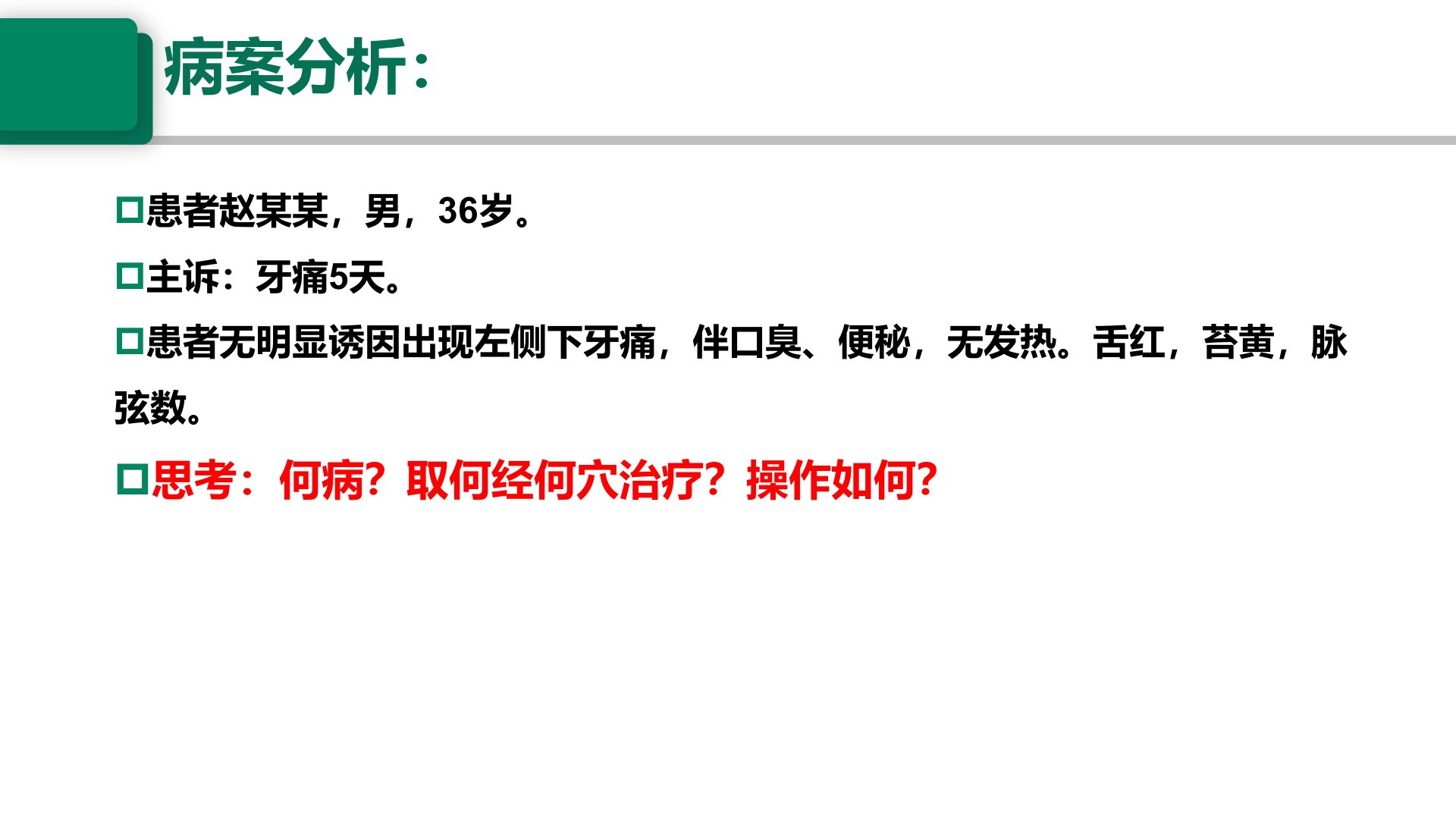 手阳明经络与腧穴摘要一、手阳明经脉循行手阳明大肠经起于食指桡侧端沿上肢外侧前缘上行经肩、颈上颜面止于对侧鼻翼旁体内支属大肠络肺联系齿、口、鼻等器官。二、手阳明络脉、经别、经筋1络脉:名偏历循行于上肢实证见龋齿痛、耳聋虚证见齿冷经气痹阻。2经别:从手循膺乳别于肩髃入柱骨下走大肠属于肺上循喉咙出缺盆合于阳明。3经筋:起始于第二手指绕侧端结于腕背部循行于上肢、肩、颈等部位病症包括支撑不适、肩不能举等。三、手阳明腧穴共20穴重点腧穴包括商阳、二间、三间、合谷、阳溪等主治口、齿、鼻等头面器官病咽喉病及经脉循行所过的上肢外侧前缘、肩前、颈部的病变。四、病案分析患者赵某某男36岁主诉牙痛5天诊断为胃火牙痛。治法为清胃泻火通络止痛。针灸处方包括内庭(左)、合谷(右)、下关(左)诸穴均用泻法治疗3次后诸症消失。五、作业1叙述手阳明大肠经循行。2简述手阳明大肠经经穴主治概要。