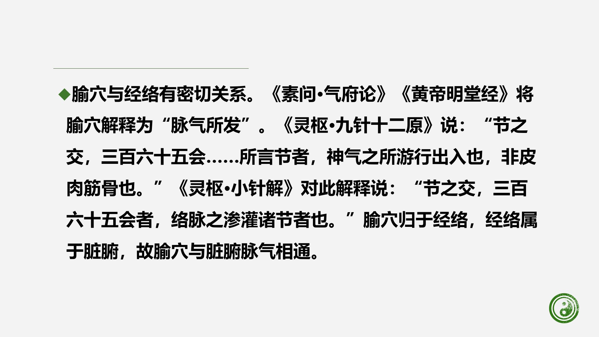 腧穴概述腧穴是脏腑经络之气输注出入的特殊部位。腧,又作“俞”,通“输”,有输注、转输之意;穴,即孔隙的意思。腧穴在《内经》中又有“节”“会”“气穴”“气府”“骨空”等名称;《甲乙经》称“孔穴”,《太平圣惠方》称“穴道”,《铜人腧穴针灸图经》通称“腧穴”,《神灸经纶》则称为“穴位”。腧穴与经络有密切关系。《素问·气府论》《黄帝明堂经》将腧穴解释为“脉气所发”。《灵枢·九针十二原》说:“节之交,三百六十五会……所言节者,神气之所游行出入也,非皮肉筋骨也。”《灵枢·小针解》对此解释说:“节之交,三百六十五会者,络脉之渗灌诸节者也。”腧穴归于经络,经络属于脏腑,故腧穴与脏腑脉气相通。《素问·调经论》指...