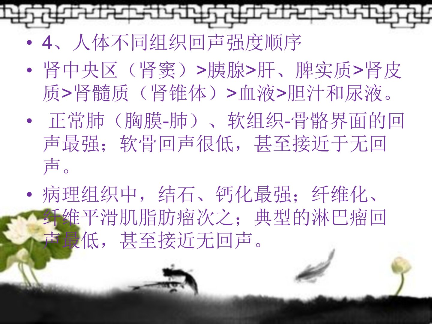 摘要人体组织和体液回声强度分为强、高、中、低及无回声五级。强回声伴声影常见于含气肺、胆结石等;中等回声见于肝、脾实质;低回声见于皮下脂肪;无回声见于胆汁、尿液等。一般规律包括:均质性液体为无回声区非均质性液体回声增加纤维化、钙化等非均质性改变使回声增强。不同器官显像特点各异如皮肤呈线状强回声脂肪回声层状分布肌肉回声较脂肪强且粗糙血管形成无回声管状结构骨组织和钙化形成强回声并留有声影。病理声像图显示实质脏器病变回声表现因急性慢性而异占位病变需鉴别囊性实性、良性恶性。声衰减程度方面组织内水分越多衰减越低液体中蛋白成分、胶原蛋白和钙质越多衰减越高。声像图分析需按解剖层次进行综合若干声像图特征鉴别典型囊肿和实性肿物。超声伪像十分常见识别伪像可避免误诊还可利用其帮助诊断其产生原因包括反射、折射、衰减等。腹部超声扫描需注意被检查者体位、断面扫查解剖标志声像图方位识别需遵循规定超声诊断需满足客观性、独立性、科学性等基本要求。