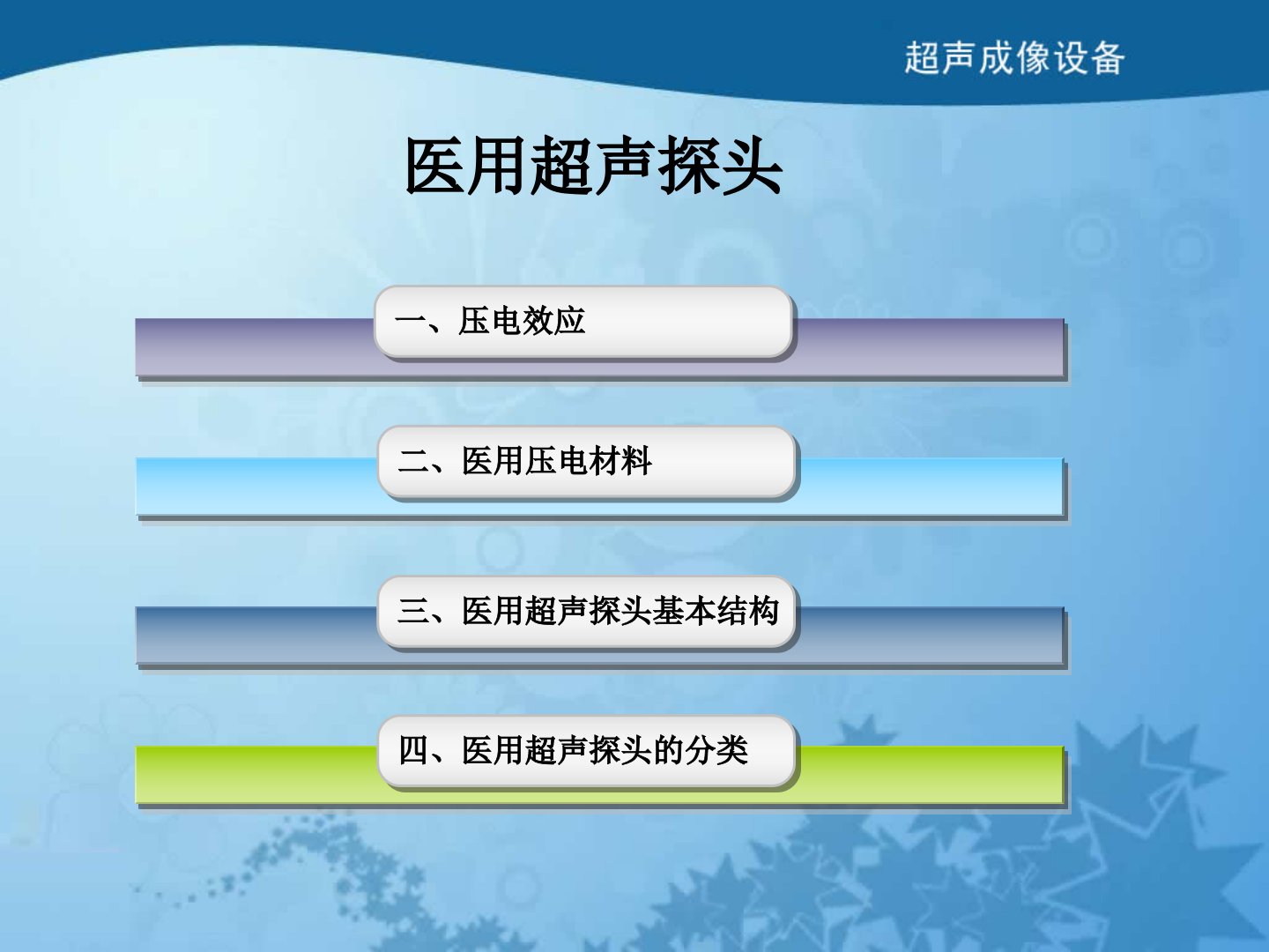 《医学影像设备学》第七章超声成像设备摘要超声探头是超声诊断仪的关键部件兼具超声发射与接收双重功能。1核心原理:基于压电效应正压电效应将机械能变成电能负压电效应将电能变为机械能。早期换能器采用有压电效应的晶体当前采用陶瓷与高分子聚合物合成的复合材料。2医用压电材料:分天然和人造两种医用多为性能稳定的人造压电晶体如压电陶瓷PZT陶瓷纯净波晶体表现更优。主要物理参数有频率常数、发射和吸收系数、介电常数、机电耦合系数、晶体的温度效应等。3基本结构:含聚焦装置、匹配层、压电晶片、吸声块等可实现声波发射与接收、发射聚焦、接收聚焦等功能。4分类:结构、型式等对超声束形状影响大按工作方式分脉冲回波式和多普勒式。脉冲回波式常见电子探头新技术可实现面阵扫描;多普勒探头用于测量血流参数等;还有腔内探头经体腔接近深部组织近年发展了经血管探头。