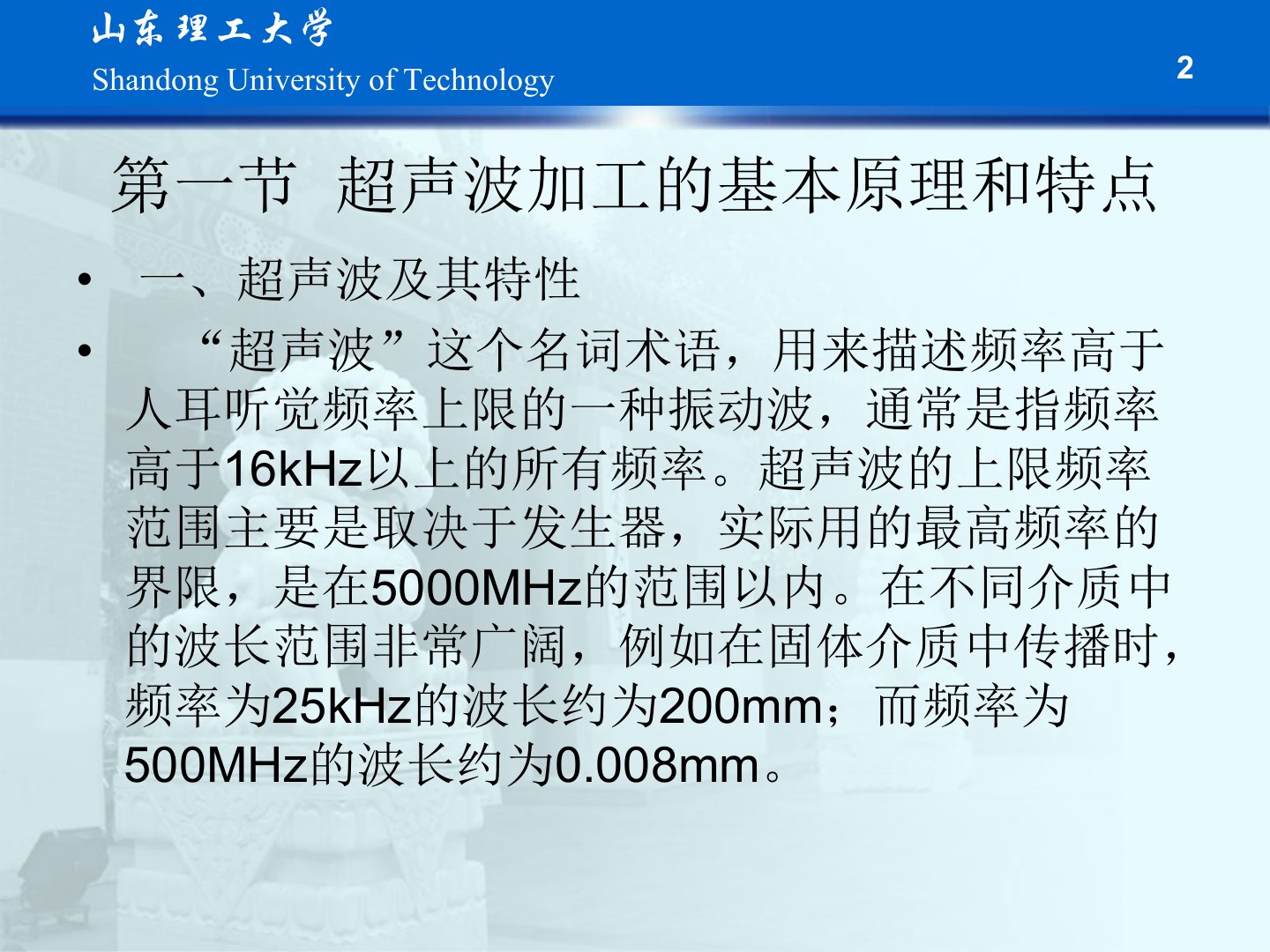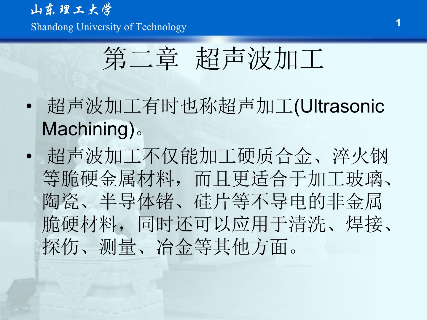 第二章超声波加工摘要超声波加工亦称超声加工适用于硬质合金、淬火钢等脆硬金属及玻璃、陶瓷等非金属材料还用于清洗、焊接、探伤等领域。其基本原理是利用工具端面的超声振动通过磨料悬浮液对脆硬材料进行成型加工。超声波是频率高于16kHz的振动波具有传递强能量、空化作用及反射、透射、折射等特性。加工时工具以一定力作用在工件上超声换能器产生纵向振动经变幅杆放大后驱动工具端面振动使磨粒锤击、冲击工件表面。其特点包括适合加工硬脆材料、工具形状可复杂、切削力小、不会引起变形及烧伤、加工精度高。超声波加工设备包括超声发生器、超声振动系统、机床本体和磨料工作液循环系统。其中换能器利用压电效应或磁致伸缩效应实现机声转换变幅杆放大振动幅度。加工速度受振幅、频率、静压力、磨料种类和粒度等因素影响加工精度则与磨料粒度、工具精度及磨损情况等相关。材料去除机理主要包括磨料颗粒的直接锤击、自由运动的磨料颗粒冲击、磨料悬浮液空化作用及伴随流体产生的化学作用。此外超声波还可用于清洗、焊接、乳化、搪锡、粉碎、雾化、凝聚、除气、加速过滤、振动筛、陈化、疲劳试验及声悬浮技术等方面。振动切削通过给刀具或工件加上有规律的振动减小切削力、