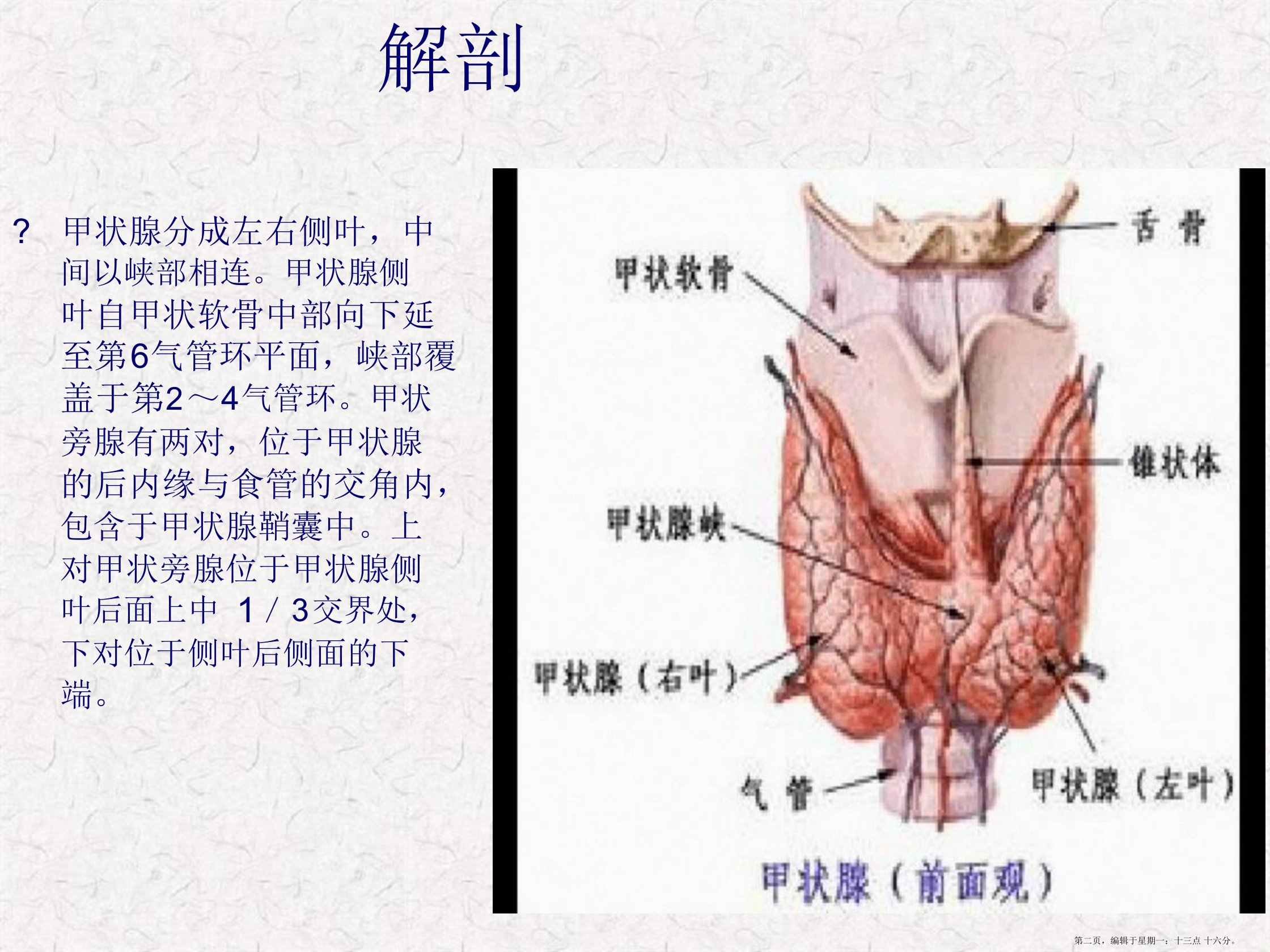 本文为医生MR杨关于常见甲状腺疾病诊断的摘要:甲状腺由左右侧叶及峡部构成甲状旁腺位于其后内缘。正常甲状腺含碘高、血供丰富CT表现密度高可清晰显示病变与周围组织关系。甲状腺疾病是第二大内分泌疾病CT平扫可发现甲状腺病变增强扫描后显示更清楚。甲状腺炎中桥本氏甲状腺炎最常见多见于3050岁女性CT表现为双侧甲状腺弥漫性增大、密度减低。亚急性甲状腺炎起病急骤CT表现为患侧甲状腺增大内有边缘模糊的低密度区。单纯性甲状腺肿因缺碘引起CT可见甲状腺对称性或不对称性增大内有多个低密度结节。结节性甲状腺肿是单纯性甲状腺肿的后期表现CT特征为甲状腺内多个、散在、规则的低密度结节。甲状腺腺瘤多为单发低密度结节甲状腺癌则表现为不规则低密度结节或肿块密度混杂多浸润性生长。最后文章总结了甲状腺疾病的临床表现和CT诊断要点包括肿块形状、大小、光滑度、生长速度等。