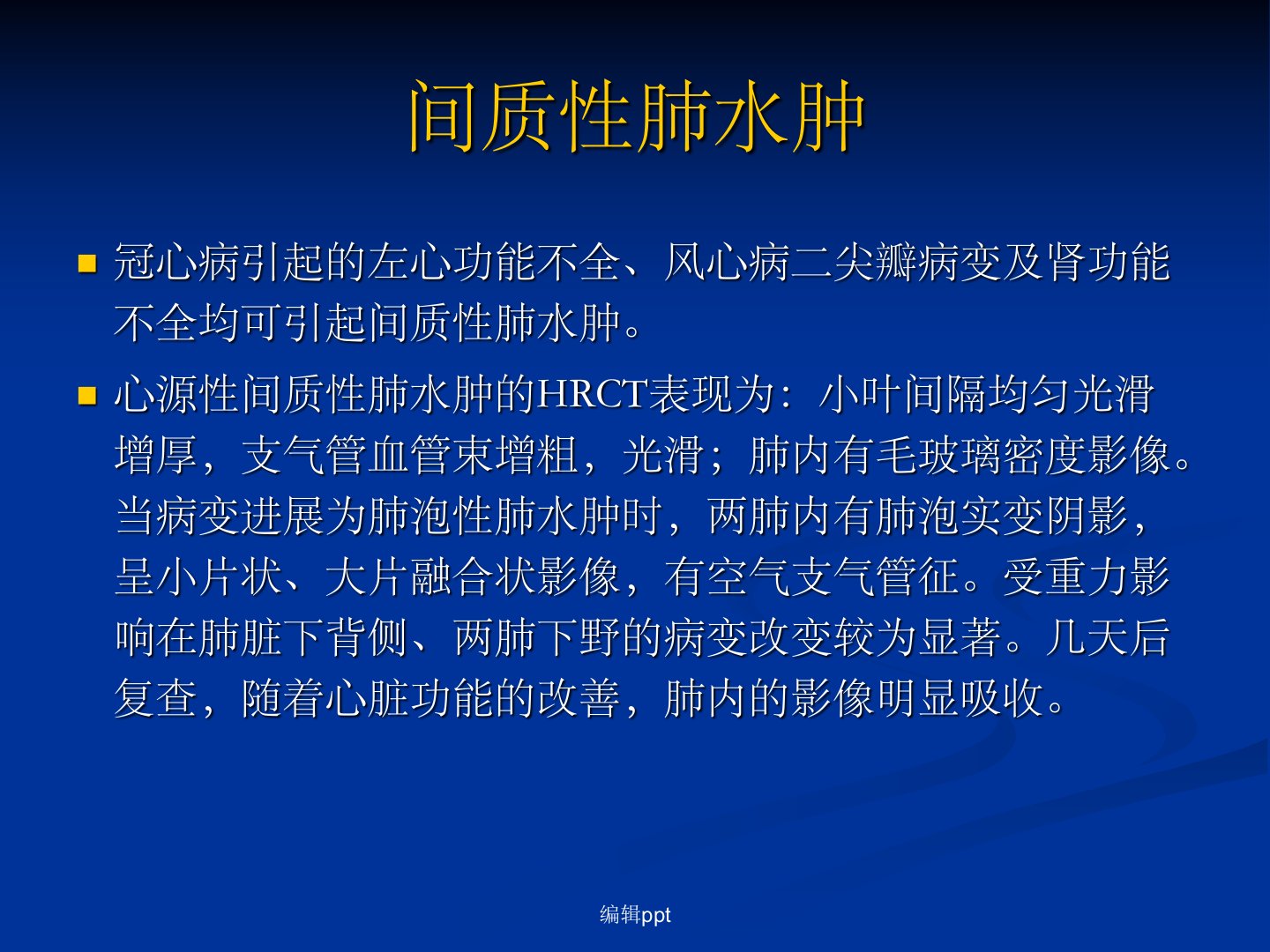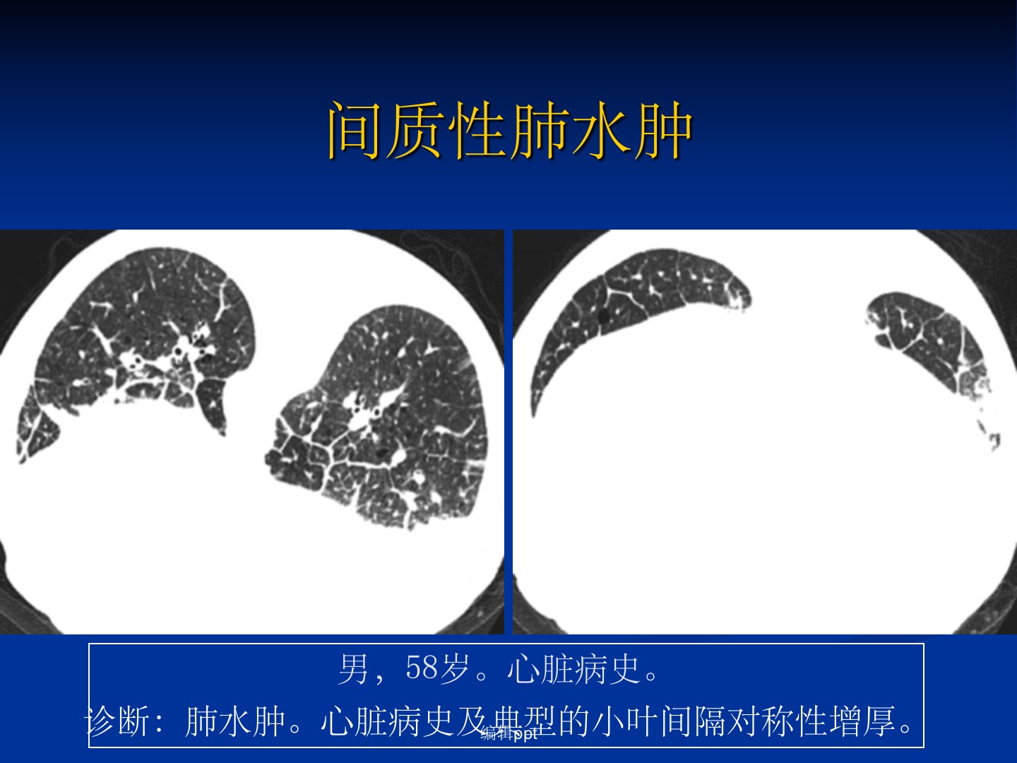 肺水肿是多种疾病引发的肺组织内体液过多积聚分为间质性和肺泡性两类常同时存在但以某一类型为主。间质性肺水肿起病缓慢液体主要积聚在肺间质特征为肺野透光度降低、肺门影增大模糊、出现KeleryA、B、C线、胸腔少量积液及支气管袖口征多由冠心病左心功能不全、风心病二尖瓣病变、肾功能不全等引发。肺泡性肺水肿起病急骤液体主要积聚在肺泡特征为双肺内中带对称性大范围渗出性病变典型者表现为“蝶翼征”或“蝙蝠征”。心源性肺水肿患者大多心脏增大有肺血重新分配双肺以肺间质肺水肿和胸腔积液为主要征像。肾性肺水肿主要是水钠潴留过多、贫血致血浆胶体渗透压降低肺纹理普遍增粗肺实变阴影中央型分布较多最终以心力衰竭的病理生理变化表现出来。溺水肺水肿因大量液体直接进入肺泡CT多显示肺泡性肺水肿征象以右侧明显。肺水肿需与肺炎、胸水、肺间质纤维化等鉴别。