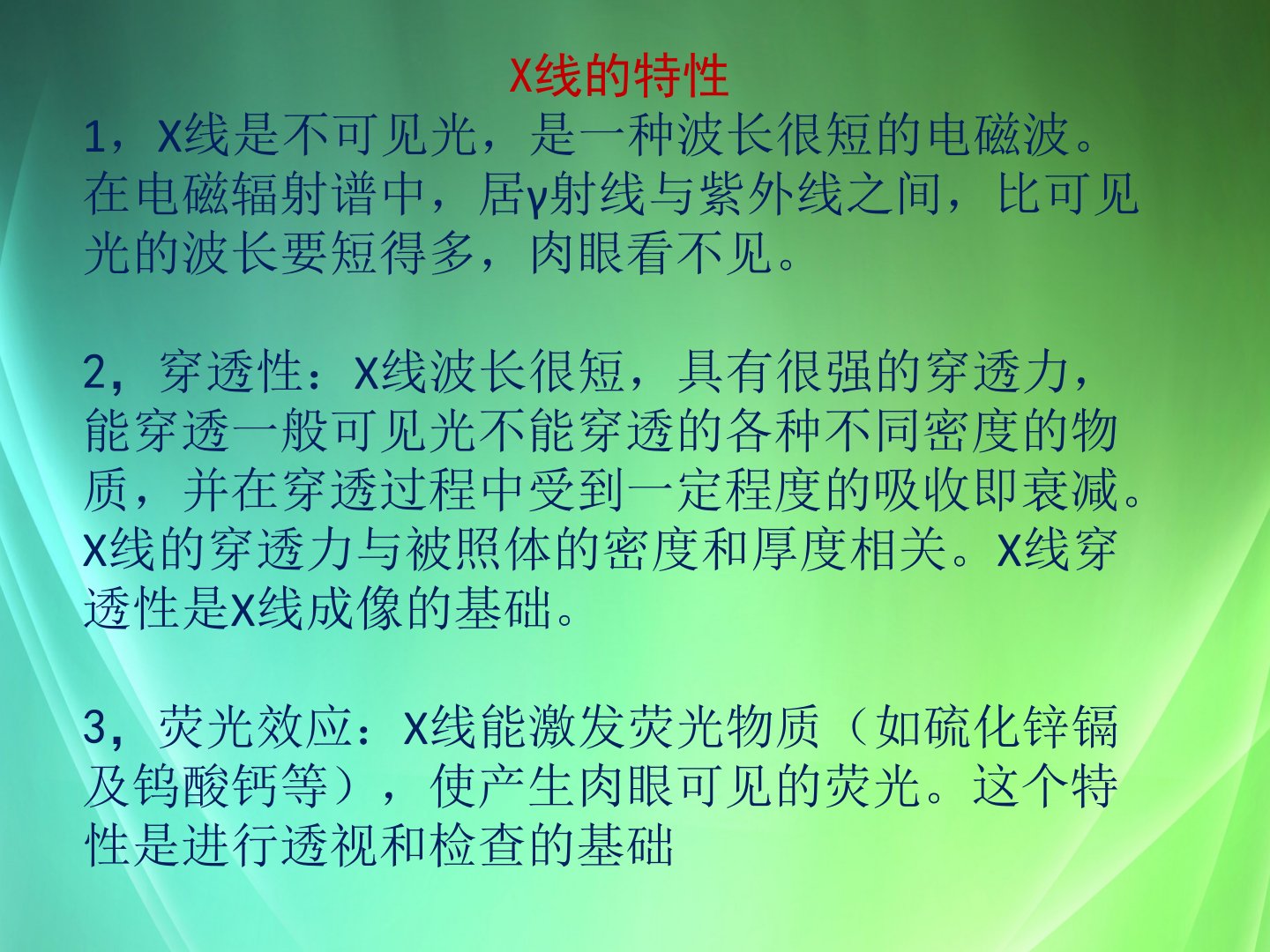 X线的基础知识及临床常规应用摘要X线是不可见光波长短在电磁辐射谱中居射线与紫外线之间具有穿透性、荧光效应、摄影效应和电离效应。穿透性使X线能穿透不同密度物质是成像基础;荧光效应可用于透视和检查;摄影效应中X线使涂溴化银的胶片感光经处理产生黑白影像;电离效应使X线通过物质产生电离进入人体产生生物效应。临床常规应用方面透视利用穿透性和荧光效应成像优点是成本低、效率高、可动态观察用于病灶定位等还能在透视下介入治疗但曝光时间长对患者伤害较大。常规拍片检查中全胸片及全胸侧位片用途广泛全胸正位片观察胸部诸骨、双肺等全胸侧位片辅助检查。看片时按由大到小、由左到右等顺序关注胸部诸骨、肺尖等看点还可通过肺野诊断分区、测量心胸比例等辅助诊断与鉴别诊断。
