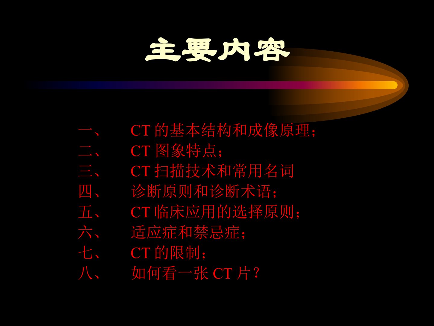 一位国际专家指出CT技术正快速发展滑环CT、螺旋CT、多层螺旋CT及电子束CT等不断更新换代同时三维重建、仿真内镜及CT透视等新技术不断涌现推动CT向更快扫描速度和更好图像质量的方向发展。CT设备基本结构包括扫描架及检查床、计算机和操纵台三部分。CT图像特点在于图像密度可量化且涉及多种扫描技术和常用名词如增强扫描、动态扫描等。在临床应用方面CT有定位活检、介入治疗等功能常用术语包括定位像、放大扫描等。CT临床应用需遵循选择原则明确适应症(如五官的眶内、副鼻窦及鼻咽癌炎症等)和禁忌症同时需注意CT的限制如病灶遗漏等问题。正确解读CT片对于明确诊断至关重要。