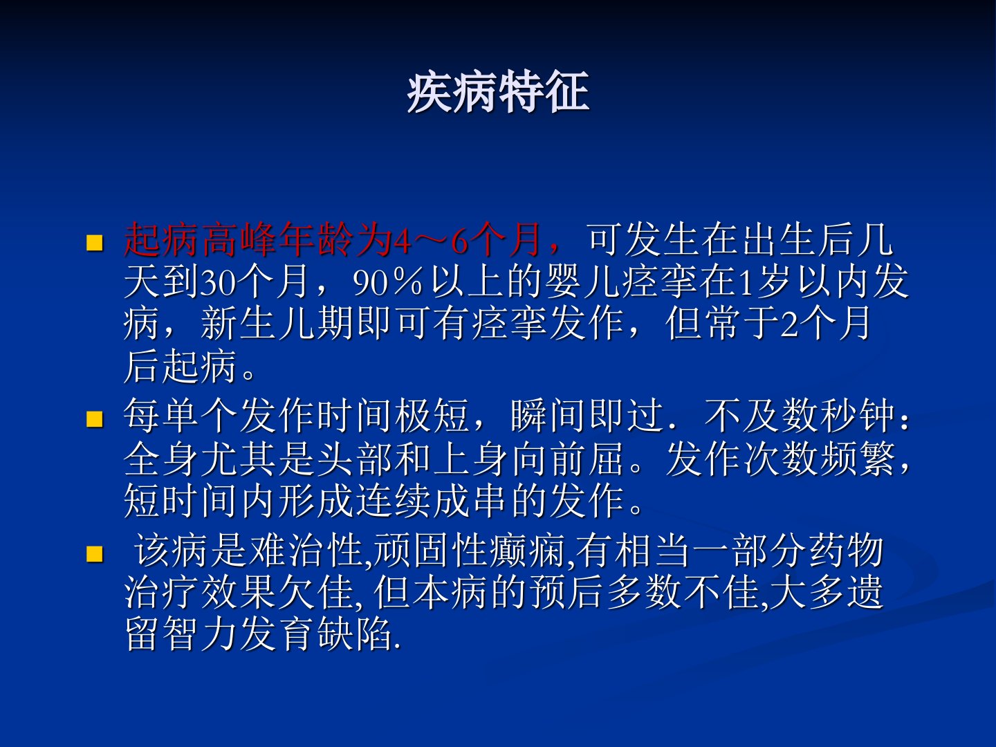 婴儿痉挛症是难治性癫痫起病高峰年龄为46个月90以上病例于1岁以内发病新生儿期即可有痉挛发作预后多不佳常遗留智力缺陷病因包括围产因素、产前因素等发病机制至今未明。临床表现主要为簇状点头强直痉挛脑电图呈高峰失律。治疗方面常规抗癫痫药是首选方案之一其中丙戊酸钠是普遍认可的一线药物有效率约40;ACTH也是首选药物之一疗效肯定有效率5478复发率2783复发患儿中约1312再用ACTH治疗仍有效。其作用机制包括刺激肾上腺皮质分泌糖皮质激素、直接促进脑成熟等。但ACTH疗程长有高血压、水电解质紊乱等副反应科学护理对完成治疗计划意义重大包括监测血压、观察水电解质变化、防治感染、静脉管理等。同时需做好家长心理护理保证治疗顺利完成提高患儿生存质量。