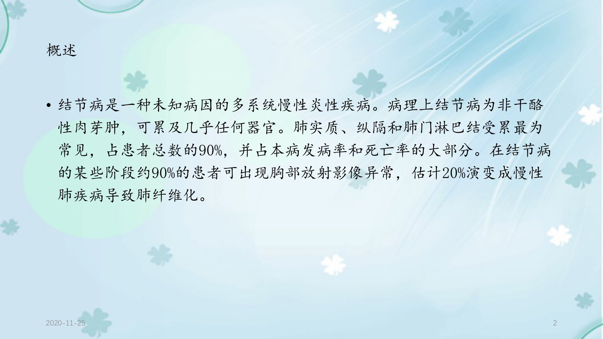 DrFeng2020年结节病HRCT诊断及鉴别诊断摘要本文概述了结节病的相关知识。结节病是一种未知病因的多系统慢性炎性疾病病理特征为非干酪性肉芽肿常累及肺实质、纵隔和肺门淋巴结。结节病好发于40岁以下成人高峰在2029岁妇女略多于男性。常见症状包括呼吸系统症状、疲劳、盗汗等但50患者无症状。结节病可能为多基因遗传病环境、职业和感染因素也可能有关。其发病机理属免疫介导与细胞介导的变态反应有关。结节病分期多样诊断属排它性需排除其他肉芽肿性疾病。活检可选经气管、CT导引或开胸肺活检等方法。CT在发现细微病变上更敏感HRCT可鉴别活动性炎症与不可逆纤维化。影像病理对照显示CT上支气管血管束结节样增厚与结缔组织鞘内的肉芽肿相对应。淋巴结增大以双侧对称肺门和右侧气管旁常见不典型类型需与淋巴瘤和结核病鉴别。肺实质病变中微结节的淋巴周围分布最常见纤维化改变逐渐明显终末期可见蜂窝和肺囊肿。伴随征象包括小叶间隔结节状增厚、肺结构扭曲等。治疗首选激素总疗程至少1年。结节病预后大多良好部分可能发展为肺纤维化。