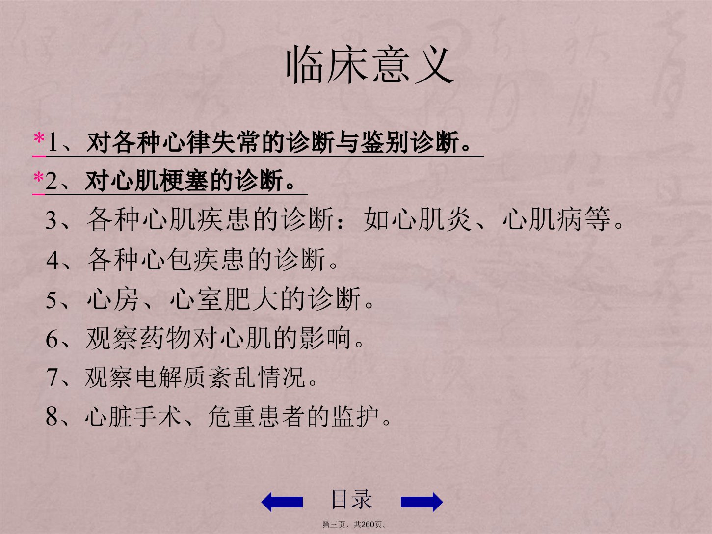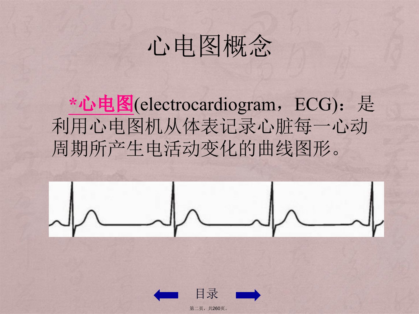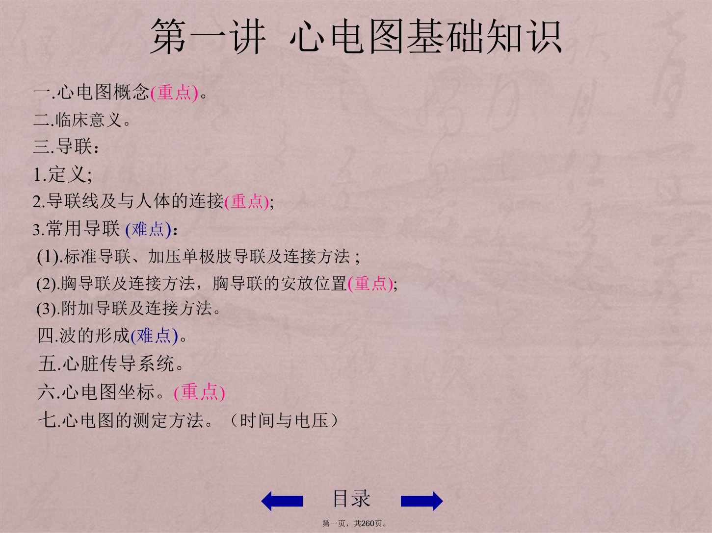 第一讲心电图基础知识一.心电图概念(重点)。二.临床意义。三.导联:1.定义;2.导联线及与人体的连接(重点);3.常用导联(难点):(1).标准导联、加压单极肢导联及连接方法;(2).胸导联及连接方法,胸导联的安放位置(重点);(3).附加导联及连接方法。四.波的形成(难点)。五.心脏传导系统。六.心电图坐标。(重点)七.心电图的测定方法。(时间与电压)目录第一页,共260页。心电图概念*心电图(electrocardiogram,ECG):是利用心电图机从体表记录心脏每一心动周期所产生电活动变化的曲线图形。目录第二页,共260页。临床意义*1、对各种心律失常的诊断与鉴别诊断。*2、对心肌梗...