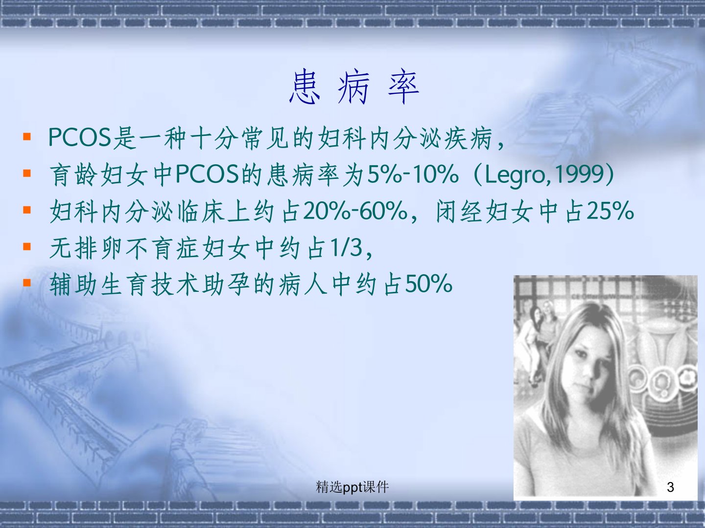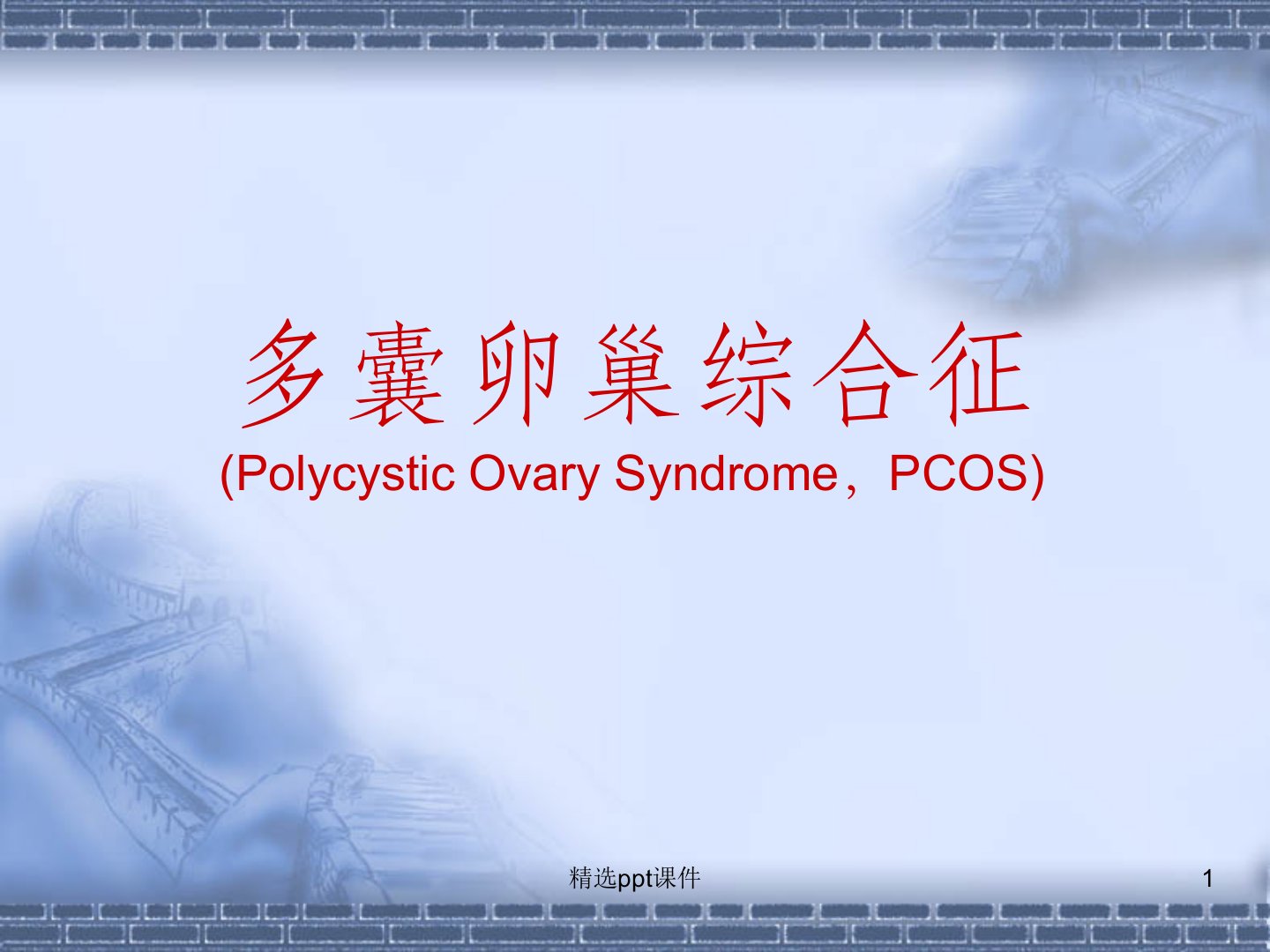 多囊卵巢综合征(PolycysticOvarySyndrome,PCOS)精选ppt课件定义是指青春期前后发病,卵巢泡膜细胞良性增生引起的雄激素生成过多造成月经紊乱、持续排卵障碍、高雄激素血症、卵巢多囊样变等一系列表现。精选ppt课件患病率PCOS是一种十分常见的妇科内分泌疾病,育龄妇女中PCOS的患病率为5%-10%(Legro,1999)妇科内分泌临床上约占20%-60%,闭经妇女中占25%无排卵不育症妇女中约占1/3,辅助生育技术助孕的病人中约占50%精选ppt课件临床表现青春期发病PCOS患者初潮年龄一般正常,各种症状多在青春期月经初潮前后不久陆续出现,提示内分泌紊乱发生在下丘脑-垂体...