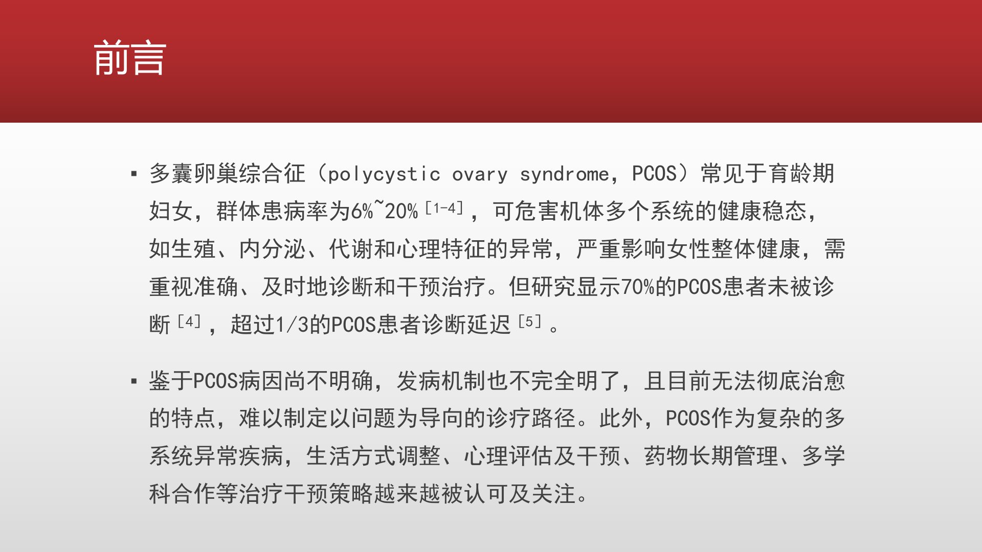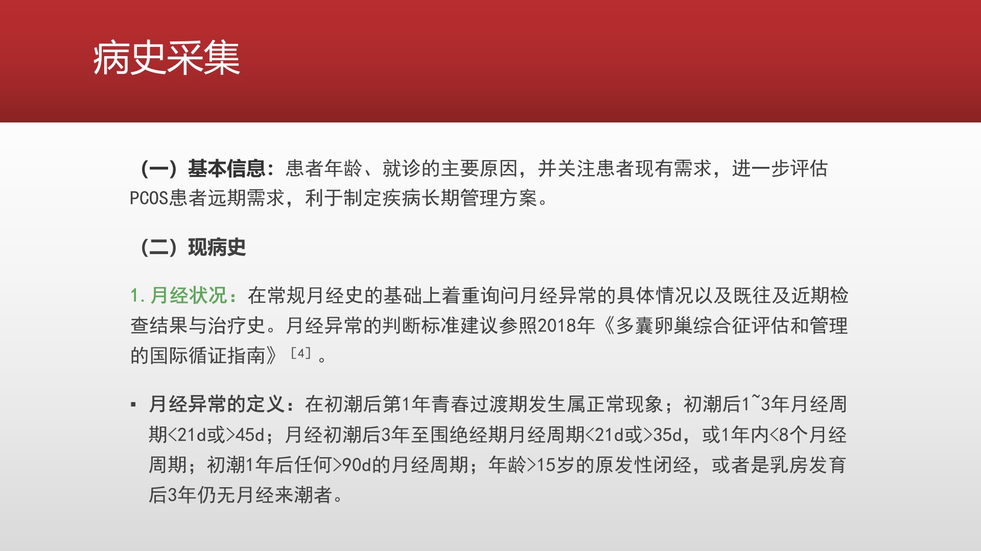 《多囊卵巢综合征诊治路径专家共识》摘要多囊卵巢综合征(PCOS)常见于育龄期妇女患病率为620危害多个系统健康但70患者未被诊断超13诊断延迟。PCOS病因、机制不明且无法彻底治愈生活方式调整等多学科合作治疗策略备受关注。病史采集涵盖基本信息、现病史(月经状况、高雄激素血症表现、用药等)、婚育及避孕史、既往史和手术史、家族史和药物过敏史。体格检查包括一般情况、全身检查、高雄激素血症相关表现及妇科检查。辅助检查有盆腔超声、实验室检查(高雄激素血症、生殖内分泌激素、代谢水平评估)及心理健康筛查。成人诊断采用鹿特丹标准符合月经异常、高雄激素血症临床表现或高雄激素血症、PCOM其中2条排除其他疾病即可诊断。青春期PCOS不建议以超声检查出PCOM来诊断必要条件是高雄激素血症等。治疗应个体化无生育需求者重视基础治疗包括调整生活方式、月经周期、高雄激素治疗及代谢调整;有生育计划者先基础治疗不孕者判断其他因素后进行孕前咨询、改善生活方式、诱导排卵等治疗必要时行腹腔镜卵巢打孔术、体外受精胚胎移植。此外要随访预防远期并发症。