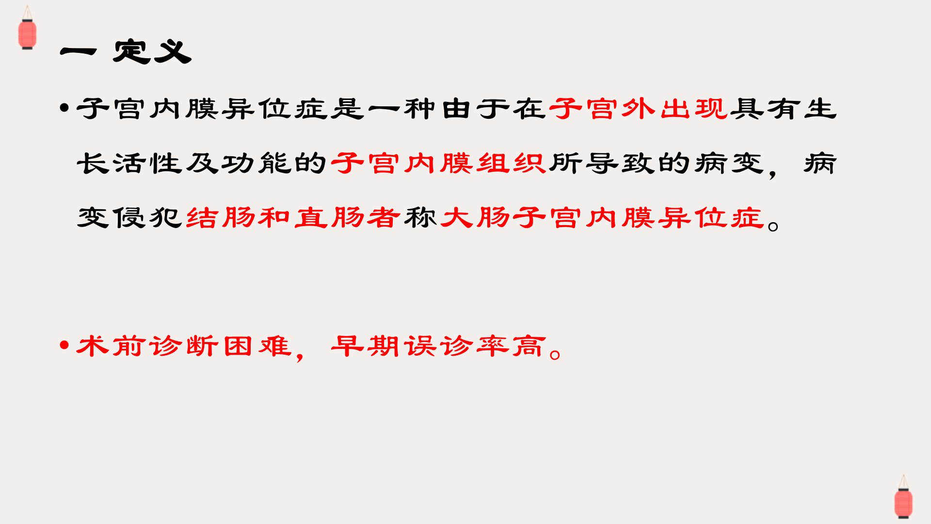 谢德正医生介绍了大肠子宫内膜异位症相关知识:该病是子宫外出现有活性的子宫内膜组织导致的病变侵犯结肠和直肠者称大肠子宫内膜异位症术前诊断困难早期误诊率高。发病特点上75病例发生于2040岁女性25直至绝经期个别长期接受雌激素治疗的男性病人也有报道。典型症状为月经周期相关性下腹部疼痛及肠道刺激症状。辅助检查方面X线钡剂灌肠造影、纤维结肠镜、腹腔镜、MRI、经阴道超声等各有特点。诊断要点主要依靠病史、症状、体征及必要检查按病变程度分为轻、中、重三度。治疗上中医有气滞血瘀证、寒凝血瘀证等辨证论治;非手术治疗可缓解症状但不能根治;手术治疗包括姑息性、半根治、根治性手术。随着检查普及诊断变易但治疗仍棘手需加深认识、早期诊断、跨科室合作。