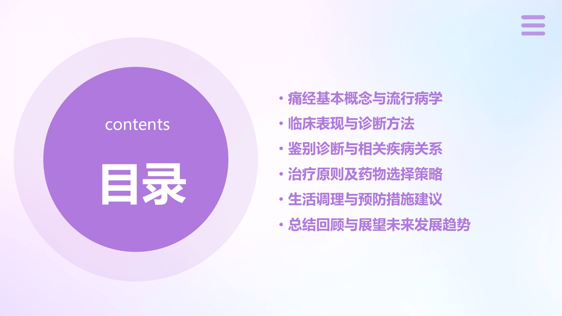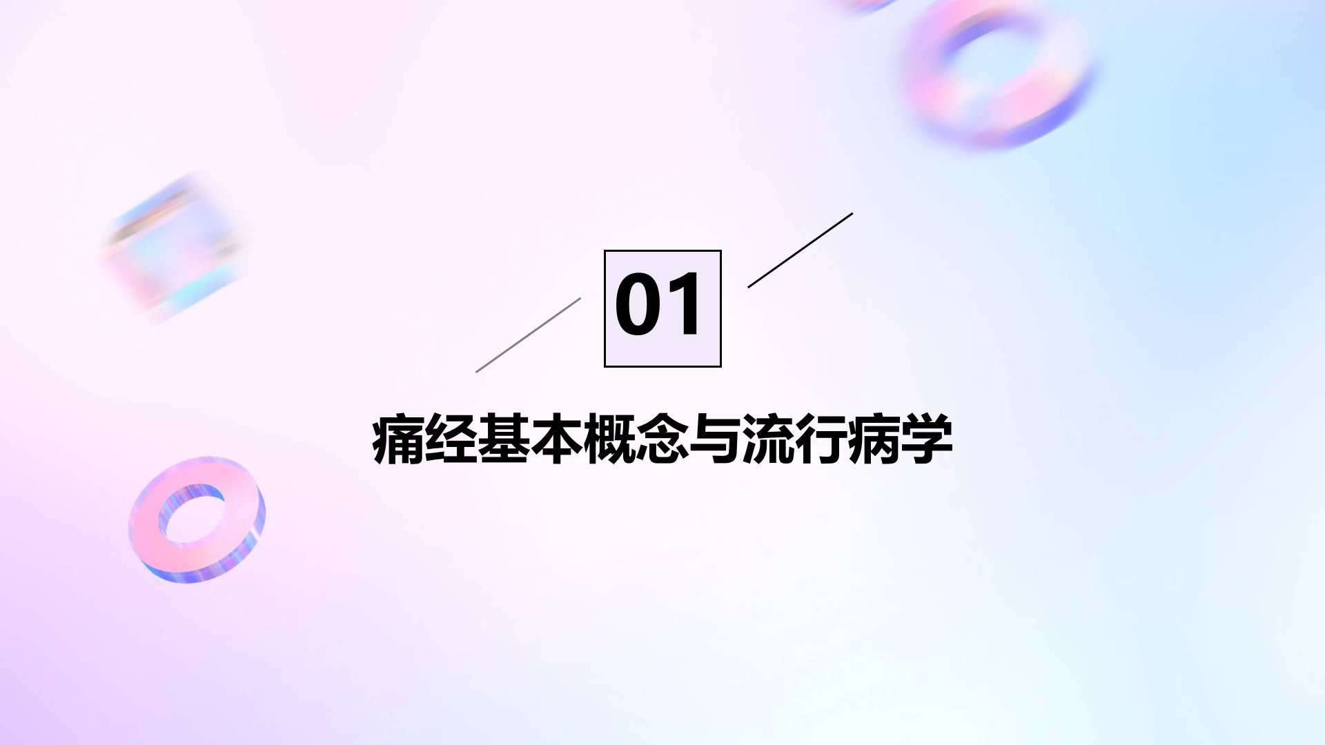 《痛经》PPT课件摘要痛经指月经期间或前后出现的下腹部疼痛等症状严重影响生活质量分原发性和继发性两类。原发性痛经占90以上与子宫收缩异常、前列腺素合成和释放过度等有关;继发性痛经由盆腔器质性疾病引起。痛经在女性中非常普遍多发生在青春期女性不同地域和种族发病率有差异。临床表现上疼痛多位于下腹部可放射至腰部或大腿内侧多为阵发性绞痛或持续性钝痛伴有恶心、呕吐等全身症状。诊断方法包括腹部触诊、妇科检查、血液检测、激素水平检测及影像学检查。治疗上有心理治疗、物理治疗、饮食调整、药物治疗、针灸及中药内治外治等方法。生活调理方面建议合理饮食、适当运动、学会放松、保持良好心态和充足睡眠。未来痛经治疗将朝着神经调节治疗、新型药物研发及综合治疗等方向发展。