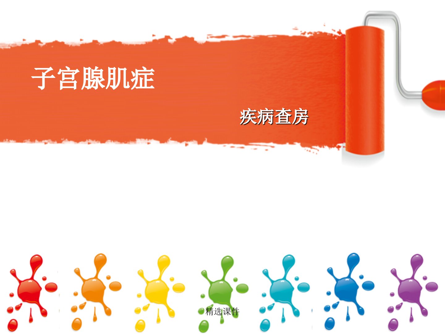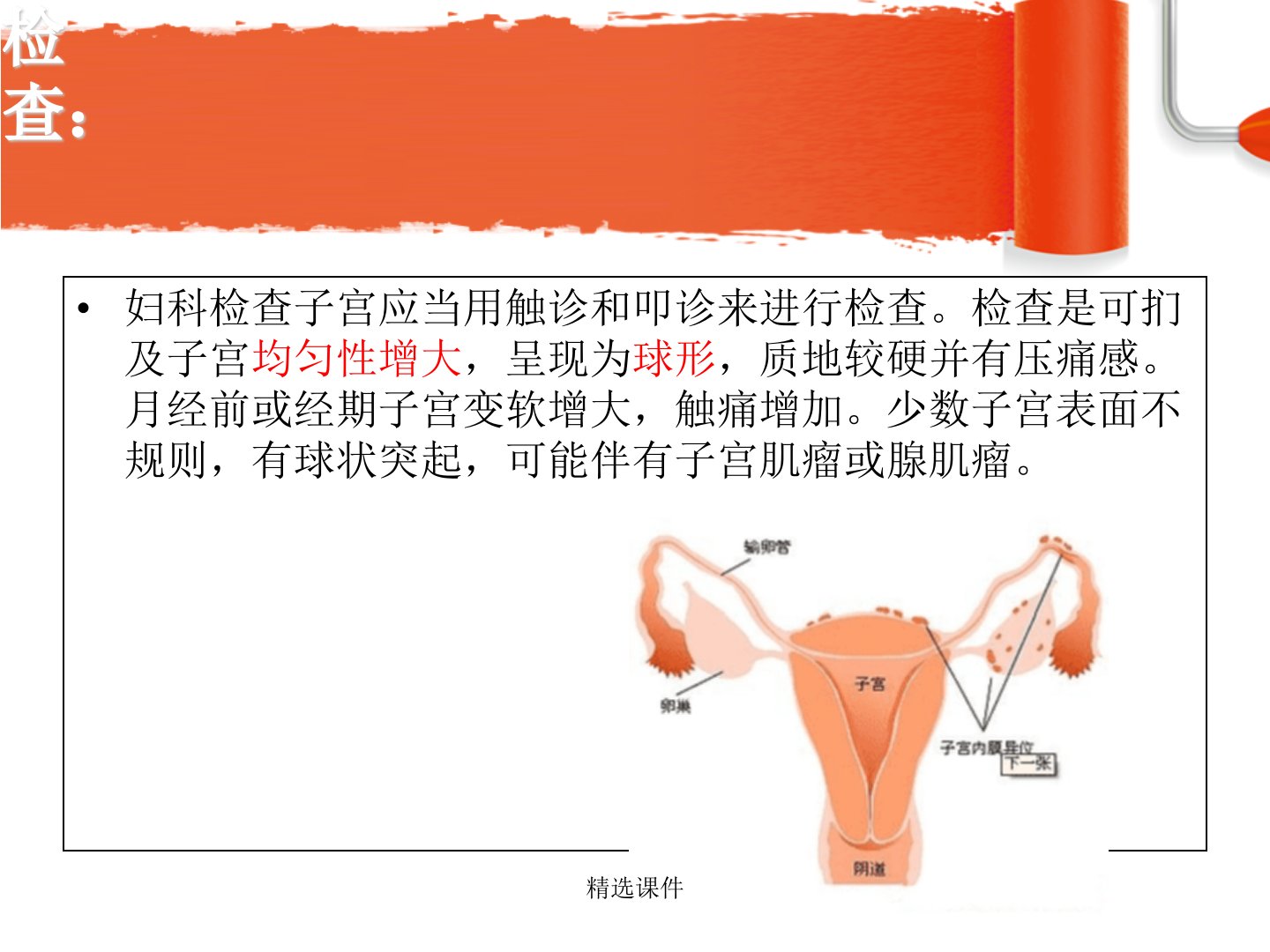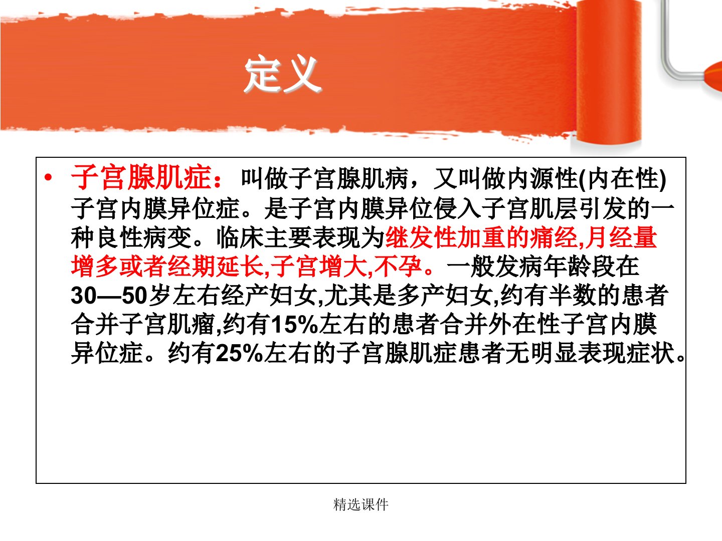 子宫腺肌症疾病查房精选课件定义子宫腺肌症:叫做子宫腺肌病,又叫做内源性(内在性)子宫内膜异位症。是子宫内膜异位侵入子宫肌层引发的一种良性病变。临床主要表现为继发性加重的痛经,月经量增多或者经期延长,子宫增大,不孕。一般发病年龄段在30—50岁左右经产妇女,尤其是多产妇女,约有半数的患者合并子宫肌瘤,约有15%左右的患者合并外在性子宫内膜异位症。约有25%左右的子宫腺肌症患者无明显表现症状。精选课件妇科检查:妇科检查子宫应当用触诊和叩诊来进行检查。检查是可扪及子宫均匀性增大,呈现为球形,质地较硬并有压痛感。月经前或经期子宫变软增大,触痛增加。少数子宫表面不规则,有球状突起,可能伴有子宫肌瘤或腺肌...