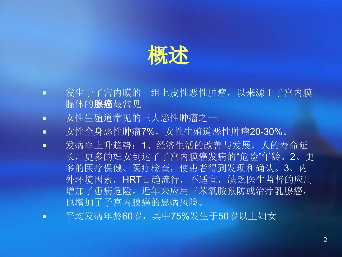 子宫内膜癌摘要子宫内膜癌是发生于子宫内膜的上皮性恶性肿瘤多为腺癌是女性生殖道常见三大恶性肿瘤之一发病率呈上升趋势。原因包括寿命延长、医疗检查增加、HRT应用及三苯氧胺的使用等平均发病年龄60岁75发生于50岁以上妇女。发病因素:I型为雌激素依赖型与无孕激素对抗的雌激素长期作用有关较年轻患者常伴有肥胖、高血压等疾病;II型为非雌激素依赖型与雌激素无明确关系多见于老年体瘦妇女。病理特征:巨检分为弥散型、局灶型镜检及病理类型多样。多数生长缓慢但部分特殊病理类型可短期转移。临床表现:多见于老年妇女约90患者有阴道流血或排液晚期有全身症状。诊断:结合病史、体征和相关检查诊断性刮宫是确诊依据。治疗:以手术为主早期患者按手术病理分期结果选择辅助治疗晚期采用综合治疗。预后:受肿瘤生物学特性、病变范围、患者全身状况和治疗方案选择影响。