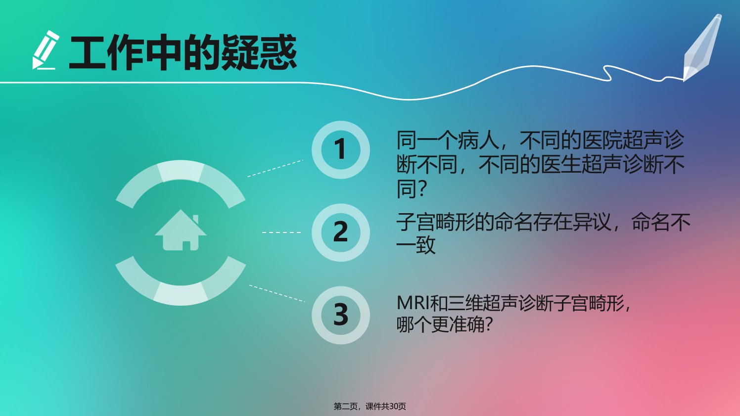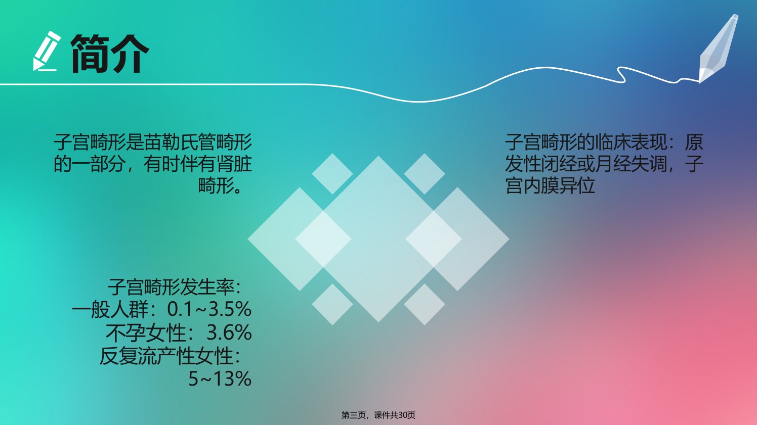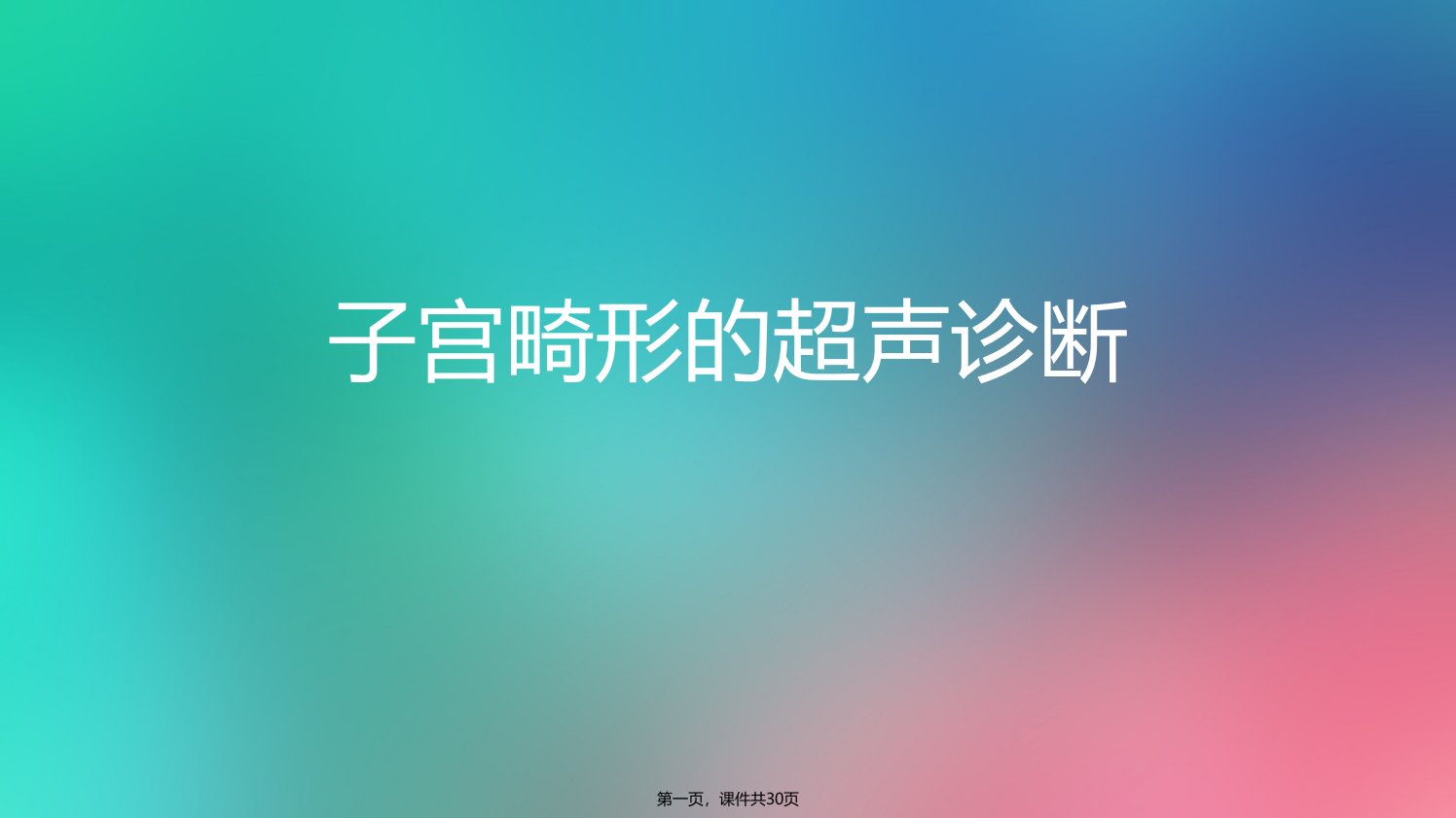 《子宫畸形的超声诊断》摘要本课件共30页主要探讨子宫畸形的超声诊断相关问题。工作中存在诸多疑惑如同一个病人在不同医院、不同医生处超声诊断结果不同子宫畸形命名有异议以及MRI和三维超声诊断子宫畸形哪个更准确。子宫畸形是苗勒氏管畸形的一部分有时伴肾脏畸形一般人群发生率0135不孕女性36反复流产女性513临床表现有原发性闭经、月经失调、子宫内膜异位等。生理解剖上中肾管和副中肾管发育情况不同胚胎9周双侧副中肾管融合形成子宫阴道管等。美国生殖协会1988年将子宫畸形分为7种主要类型包括子宫发育不良不发育(含无子宫、始基子宫、幼稚子宫)、单角子宫(或合并残角子宫)、双子宫、双角子宫、纵隔子宫、弓形子宫、己烯雌酚(DES)相关的子宫畸形课件还介绍了各类子宫畸形的特征、分类及诊断思路注重横断面诊断通过观察宫底、宫腔、宫颈、阴道等情况鉴别不同类型子宫畸形。