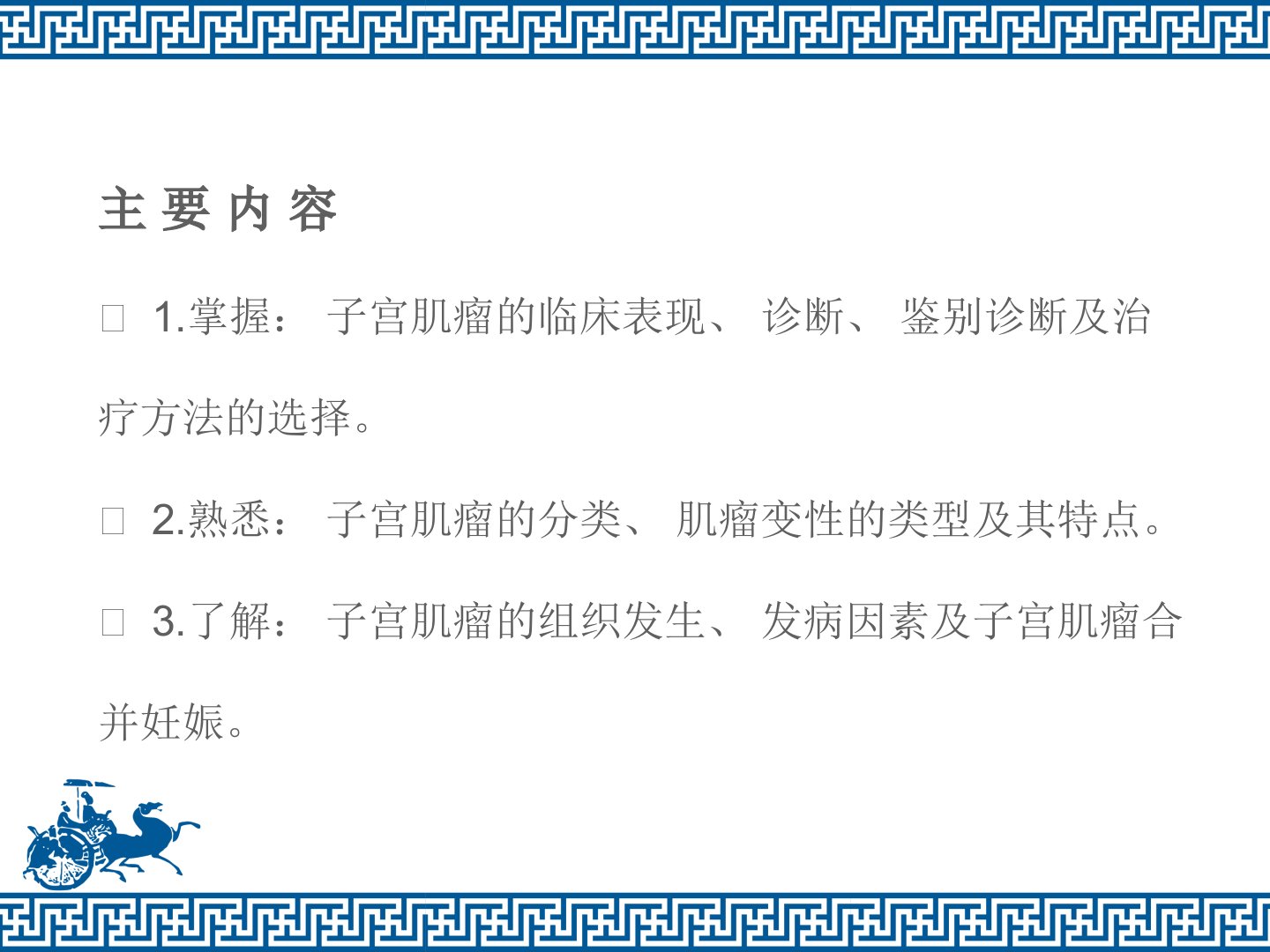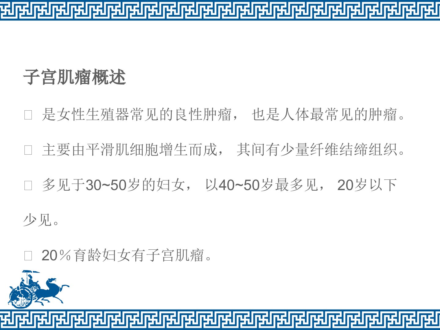 子宫肌瘤是女性生殖器常见的良性肿瘤多见于3050岁妇女主要由平滑肌细胞增生而成。其临床表现包括月经过多、下腹包块、压迫症状、白带增多、下腹疼痛及不育等症状与肌瘤生长部位紧密相关。诊断主要依据病史、症状、体征及超声检查需与妊娠子宫、卵巢肿瘤、子宫腺肌病等鉴别。治疗方面需根据患者年龄、生育要求、症状、肌瘤部位等因素综合考虑包括随访观察、药物治疗及手术治疗。药物治疗主要适用于症状轻或近绝经年龄患者但停药易复发。手术治疗则包括肌瘤切除术和子宫切除术手术途径多样。此外子宫肌瘤的超声介入、微波、动脉栓塞、冷冻等疗法为新进展。子宫肌瘤合并妊娠时妊娠期肌瘤可迅速增大分娩后可缩小可能发生红色变性需预防产后出血根据情况决定是否切除肌瘤或子宫。