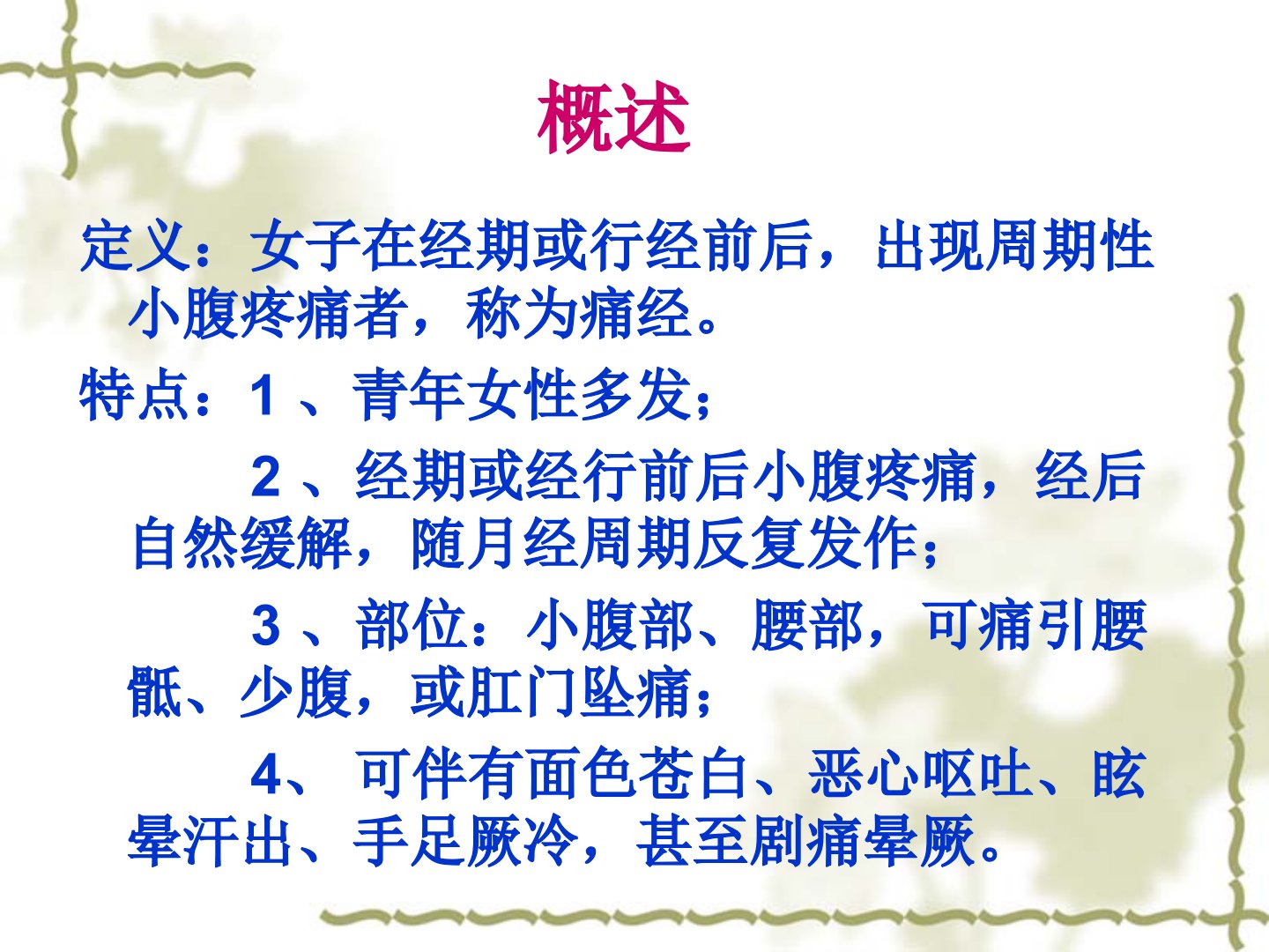 痛经指女子经期或行经前后周期性小腹疼痛青年女性多发疼痛部位主要在小腹部、腰部可伴有面色苍白、恶心呕吐等症状。现代医学将痛经分为原发性(生殖器官无器质性病变多在婚后或分娩后好转)和继发性(生殖器官器质性病变引起多为渐进性)两类。病因病机分实证“不通则痛”和虚证“不荣则痛”。辨证论治时根据疼痛性质分辨寒热虚实分型包括气滞血瘀(经前或经期小腹胀痛拒按)、寒湿凝滞(经行小腹冷痛)、气血不足(经期或经后小腹隐痛)等。治疗原则为实证温经散寒、化瘀止痛虚证益气养血、调补冲任主穴有关元、三阴交、地机、十七椎等配穴根据证型选择。其他疗法包括耳针、穴位注射、皮肤针、皮内针法、拔罐、头皮针等。治疗痛经时经期调血止痛以治标平时辨证求因以治本宜经前3—5天开始好转后巩固2—3个疗程诊治时要认真继发性痛经宜配合对因治疗。此外还要注意经期卫生饮食有节生活调节。