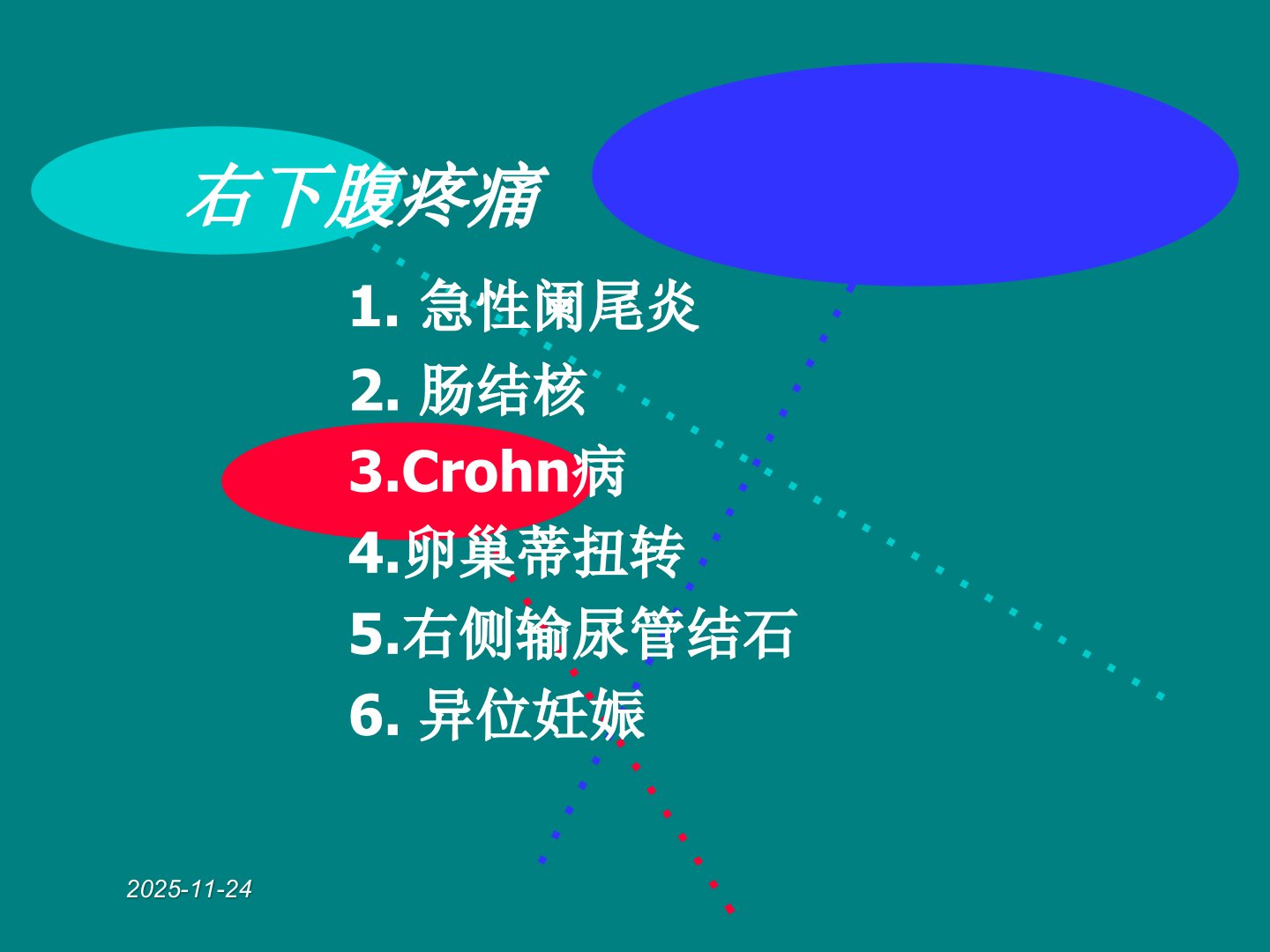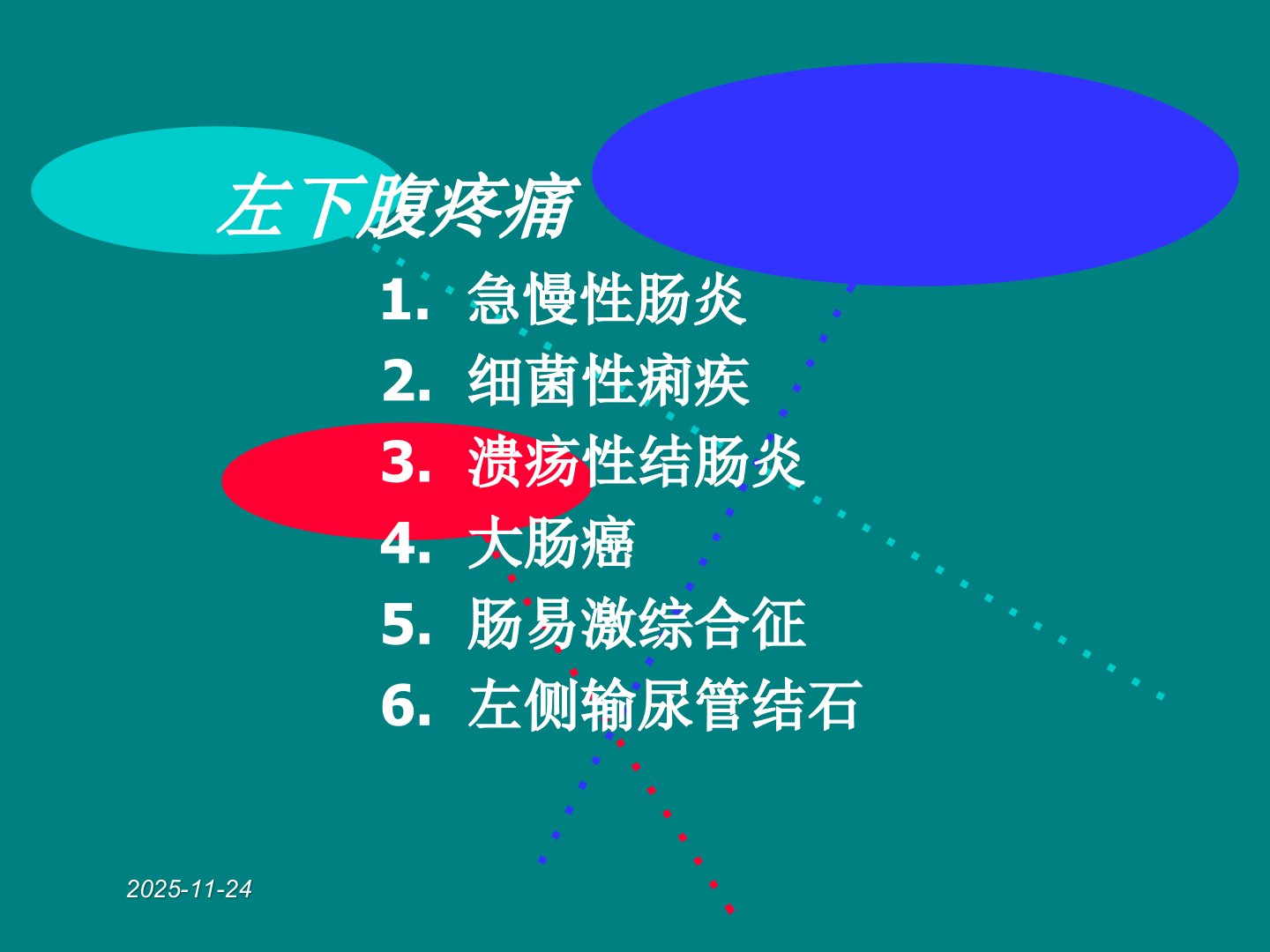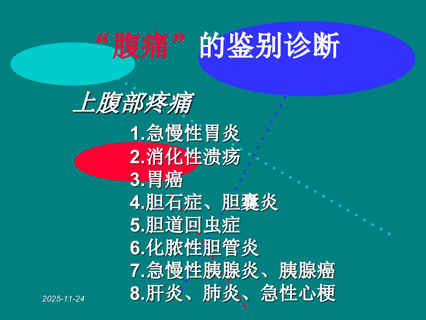 腹痛鉴别诊断复杂涉及多部位、多病因。上腹部疼痛可能为急慢性胃炎、消化性溃疡、胃癌、胆石症等多种疾病。右下腹疼痛可能与急性阑尾炎、肠结核、Crohn病、卵巢蒂扭转等有关。左下腹疼痛常见于急慢性肠炎、细菌性痢疾、溃疡性结肠炎等。全腹疼痛则可能与消化性溃疡穿孔、急性腹膜炎、异位妊娠等严重疾病相关。急性腹痛与年龄、性别有关如幼儿多见肠套叠青壮年多见急性阑尾炎等。同时腹痛性质和程度、放射痛、伴随症状也是鉴别诊断的重要依据。具体疾病如急慢性胃炎、消化性溃疡、胃癌、急性胰腺炎等均有其特定临床表现和诊断方法。