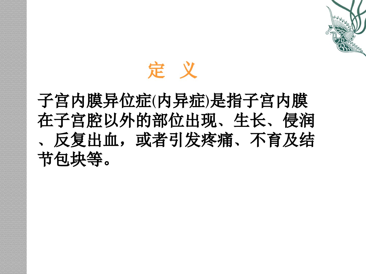 子宫内膜异位症指子宫内膜在子宫腔以外部位生长引发疼痛、不育等症状。其临床病理类型包括腹膜型、卵巢型、阴道直肠隔型和其他型。发病机制以经血逆流种植及体腔上皮化生学说为主导不同类型发病机制可能不同。临床表现主要有盆腔疼痛、不育和盆腔包块。普通部位腹腔镜检是诊断的准确方法特殊部位需结合症状和相关检查。治疗目的在于减灭病灶、缓解疼痛、促进生育、减少复发基本考虑是个体化治疗。手术是基本治疗类型包括保守性、半根治性和根治性。药物治疗理论基础是建立低雌激素或高孕激素、雄激素环境常用药物有孕激素、雄激素衍生物等。内异症易复发复发后基本遵循初治原则但应个体化。部分内异症有恶变可能卵巢不典型子宫内膜异位症可能起主要作用。此外子宫腺肌症指子宫肌层内存在子宫内膜腺体和间质主要治疗方法为手术和药物。