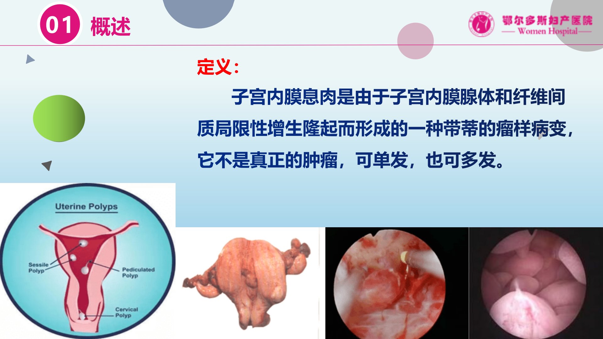 子宫内膜息肉是子宫内膜腺体和纤维间质局限性增生形成的瘤样病变非真正肿瘤可单发或多发多见于35岁以上妇女存在一定发病率、复发率和恶变率。中年以后、高血压、肥胖等人群为其高危因素炎症、激素失衡等是其病因可分增生型等多种类型会有异常子宫出血等症状。诊断方法包括经阴道超声、超声造影等对于息肉直径小且无症状者可观察随诊。治疗方面息肉体积较大且有症状时推荐宫腔镜下息肉摘除及刮宫;无生育需求、多次复发者可考虑子宫内膜切除术;恶变风险大者考虑子宫切除术。术后为预防复发近期有生育需求的患者切除术后可用COC预防;无生育需求者可考虑LNGIUS。绝经期子宫内膜息肉应选择手术治疗乳腺癌患者长期服用TMX可用定期黄体酮撤退或放置曼月乐环减少内膜息肉发生。