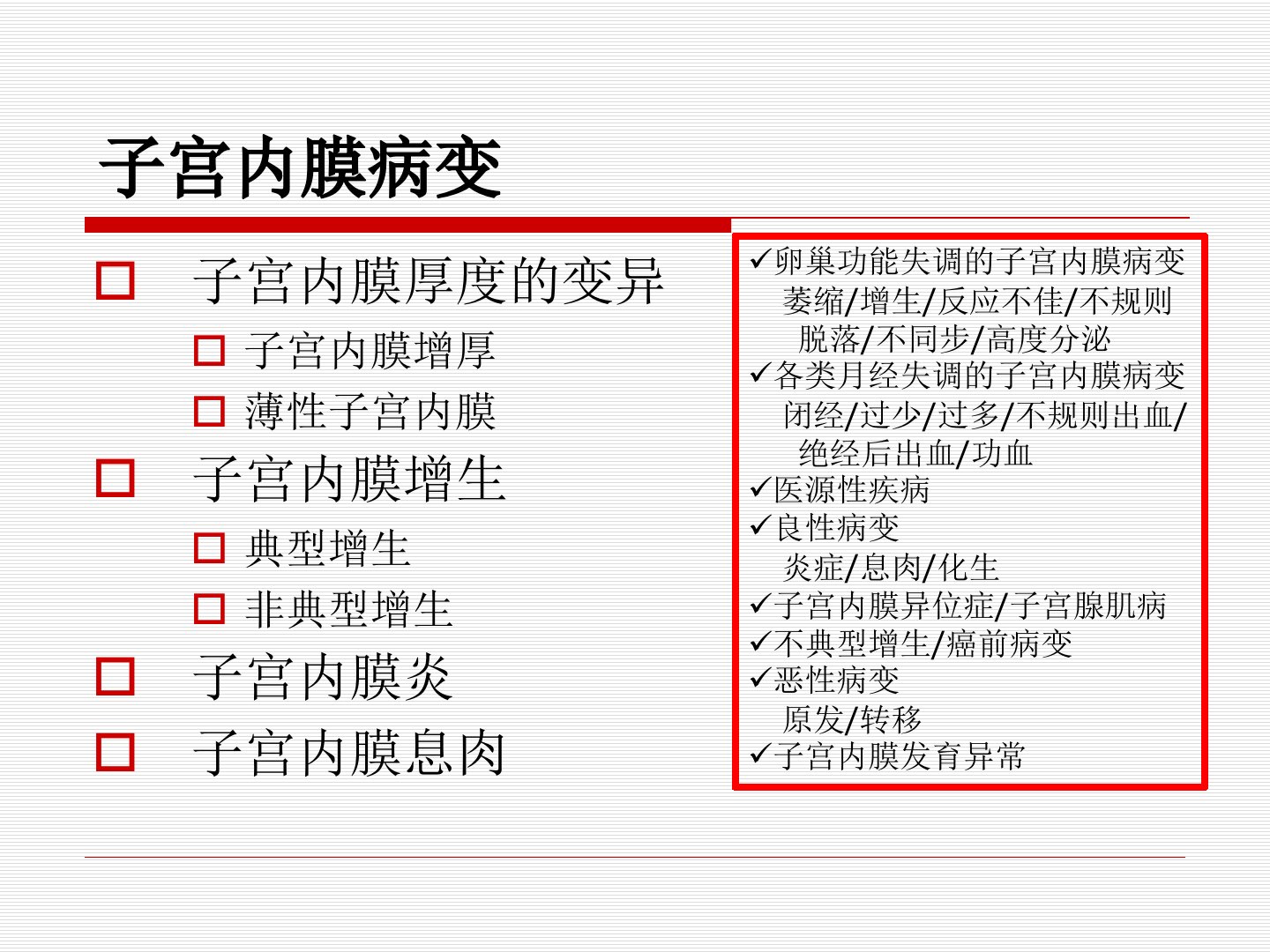 中国医学科学院北京协和医院邓姗医生对子宫内膜病变的诊治进行了总结。子宫内膜病变包括子宫内膜增厚、薄性子宫内膜、子宫内膜增生(典型与非典型)、子宫内膜炎、子宫内膜息肉等还涉及因卵巢功能失调、医源性疾病等导致的各类月经失调。急性子宫内膜炎常伴随急性盆腔炎性疾病出现推荐在终止妊娠手术前使用预防性抗生素;慢性子宫内膜炎病因不明建议针对病因不明的患者应用口服多西环素治疗。子宫内膜息肉多为良性但绝经后女性和有出血症状女性的恶变风险更高对于绝经前女性需要切除有症状的息肉对于绝经后女性所有子宫内膜息肉都应予切除。子宫内膜厚度在绝经前女性中有周期性变化对绝经前女性异常子宫内膜厚度没有标准的阈值。子宫内膜增生传统分型有局限性2014年WHO新分类重点强调细胞异形性。治疗上结合患者生育要求和病变类型有生育要求且为典型增生和轻度不典型增生可使用周期性用药中重度不典型增生采用大剂量连续用药不典型增生患者放弃生育要求后应行子宫切除。