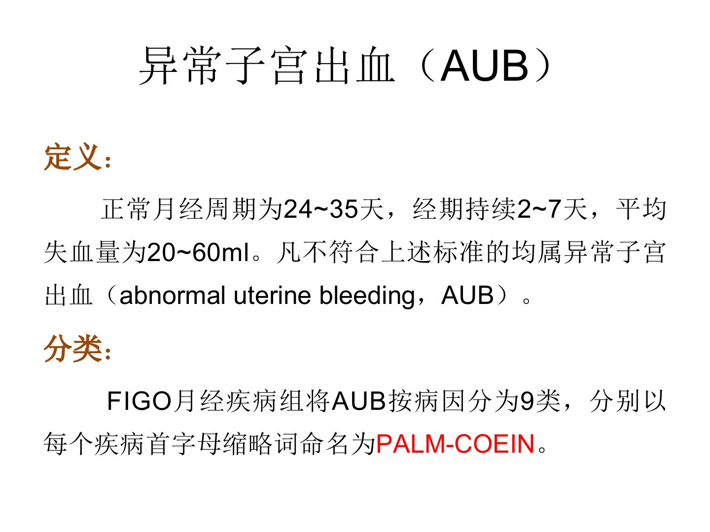 异常子宫出血(AUB)指不符合正常月经周期(2435天)、经期(27天)和平均失血量(2060ml)标准的出血。FIGO将其按病因分为9类命名为PALMCOEIN。功血(DUB)是生殖神经内分泌机制失常引起的AUB无器质性病变分为排卵性和无排卵性两类后者占85多见于青春期和更年期。无排卵性功血因HPO轴未稳定或卵巢功能低下导致雌激素异常子宫内膜出血特点为长久时多时少。治疗包括一般治疗(改善情况、抗感染、输血)、止血治疗(一般止血剂、激素止血、手术止血)和调整月经周期。无排卵型功血治疗分止血(性激素、刮宫术等)、调节周期(孕激素、口服避孕药等)和手术治疗(子宫内膜去除术、子宫切除术)。排卵性功能失调性子宫出血包括黄体功能不足等治疗以调整排卵药物和定期补充孕激素为主。治疗方法选择依据年龄、血色素、婚育史和合并疾病情况。随诊和后续治疗对青春期和围绝经期患者尤为重要。