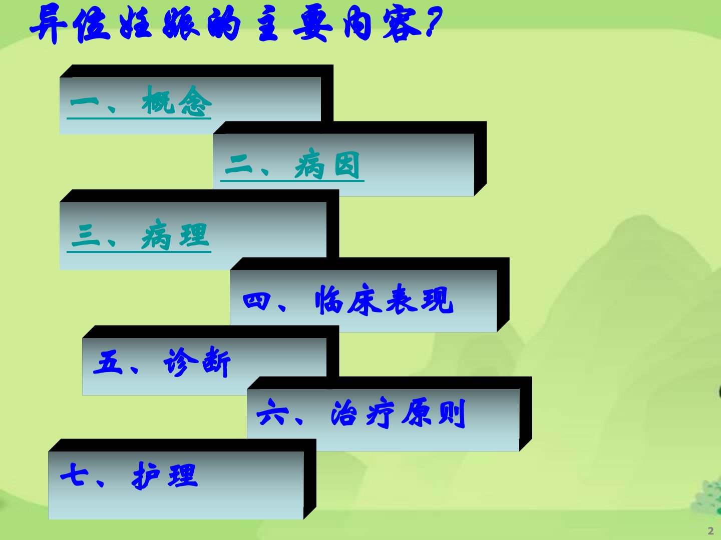 异位妊娠即受精卵在子宫体腔以外着床习称宫外孕其主要内容如下:1病因:炎症、盆腔肿物、宫内节育器节育失败、发育不良、辅助生殖技术、手术史等。2病理:包括输卵管妊娠流产、破裂陈旧性宫外孕继发性腹腔妊娠等。3临床表现:有停经、腹痛、阴道流血、晕厥休克、腹部包块等症状。4诊断:妊娠试验血HCG升高、尿HCG阳性;超声检查可见宫旁有胎芽或胎心、低回声区、液性暗区等;阴道后穹隆穿刺抽出暗红色不凝固血说明有腹腔内出血。需结合临床症状、体征及辅助检查结果综合分析确诊还要与流产、黄体破裂等鉴别。5治疗原则:手术方式有输卵管切除术、保守性手术(输卵管整形术);非手术治疗适用于早期要求保留生育能力的年轻患者;腹腔镜、宫腔镜用于鉴别诊断与治疗。6护理:评估病史、身心状况;护理诊断包括潜在并发症、恐惧、知识缺乏;护理措施有接受手术治疗患者的护理、非手术治疗患者的护理及急救护理。