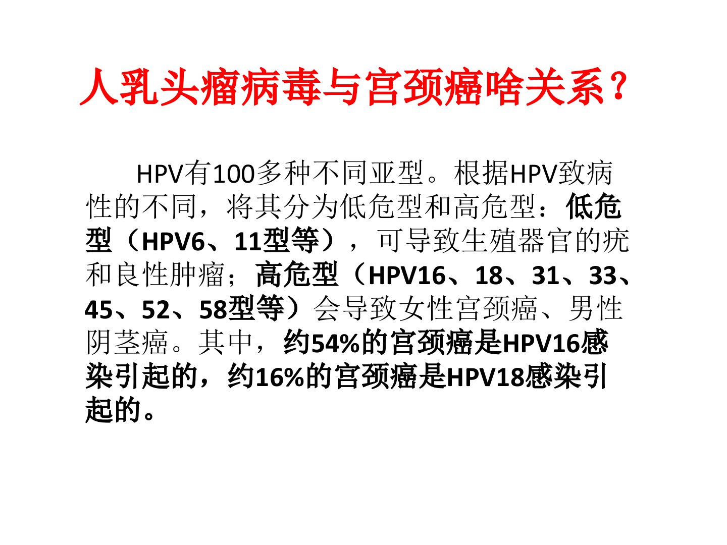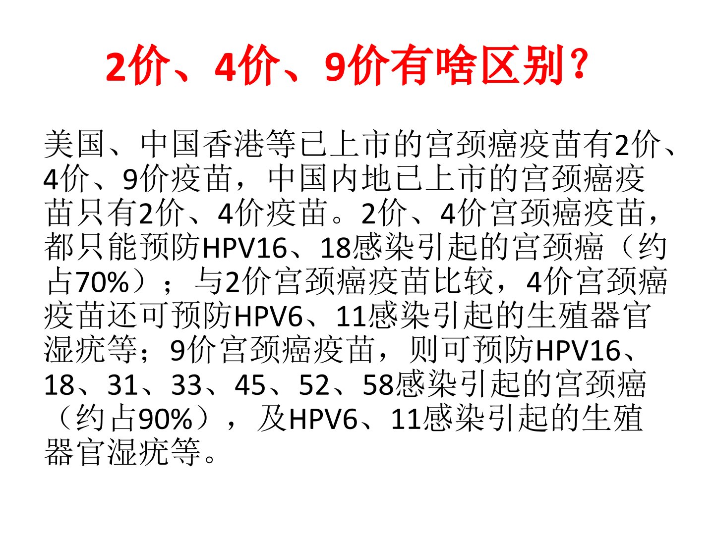 HPV有100多种亚型分低危型和高危型低危型可致生殖器官疣和良性肿瘤高危型会导致女性宫颈癌、男性阴茎癌。美国、中国香港等地已有2价、4价、9价宫颈癌疫苗上市中国内地仅2价、4价疫苗上市。2价、4价疫苗可预防70的宫颈癌9价疫苗可预防90的宫颈癌及生殖器官湿疣等。2价疫苗国内批准接种对象为925岁女性4价为2045岁女性。疫苗须6个月内接种3针。迄今为止尚未发现疫苗保护作用衰减3剂次注射方案保护作用可达20年以上并有望终生持续。妊娠期、哺乳期妇女应避免接种男性接种需经医院批准。接种疫苗后仍应定期接受宫颈癌筛查。目前HPV感染没有特效的药物治疗应注意锻炼身体增强抵抗力。妇产科医生等医疗工作者应引导父母为子女接种疫苗。