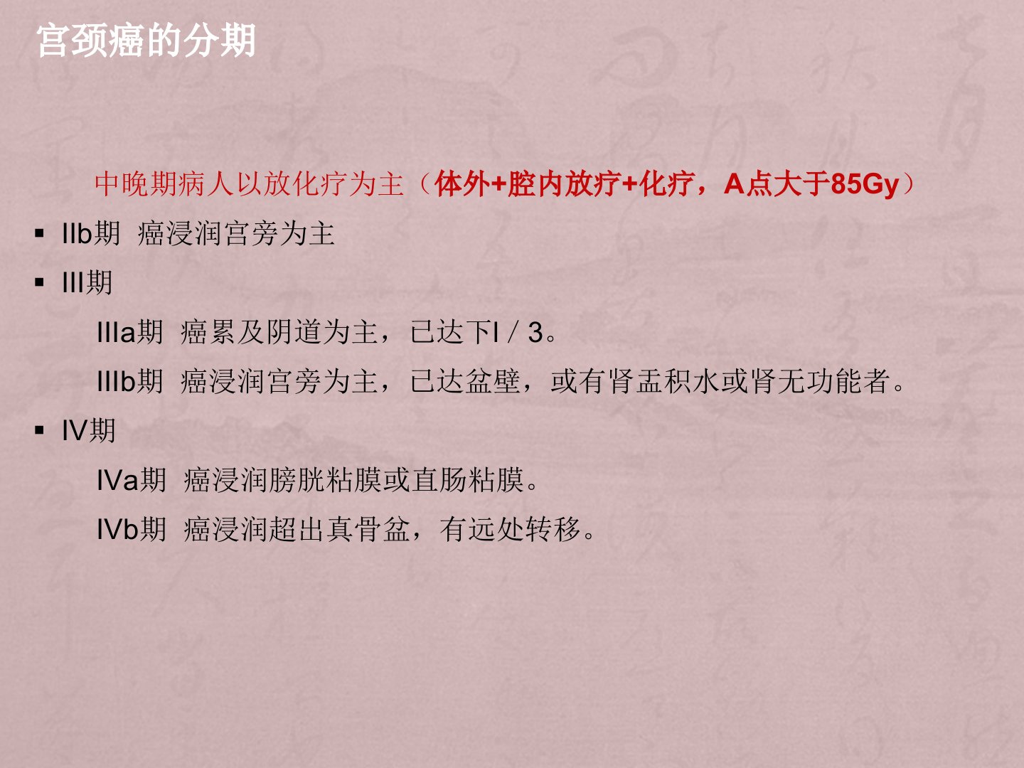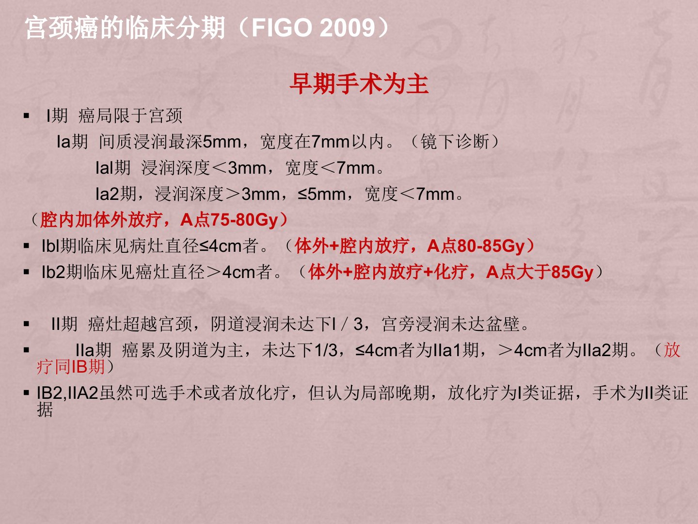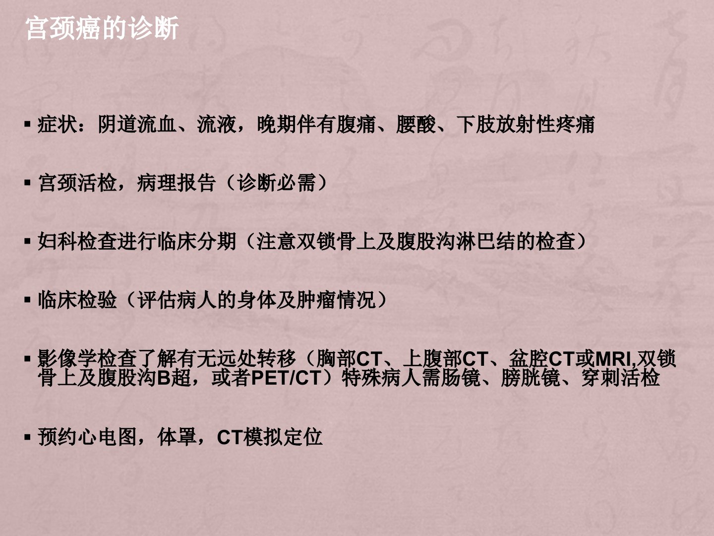 宫颈癌诊断需综合宫颈活检病理、妇科检查、临床检验及影像学检查(胸部、上腹部、盆腔CT或MRI等)结果。临床分期采用FIGO2009标准早期以手术为主中晚期以放化疗为主放化疗A点剂量大于85Gy。淋巴结转移以分站式为主患者预后差影响预后因素包括分期、病理类型、淋巴结转移等。局部晚期宫颈癌放射治疗包括体外和腔内放疗放疗范围涵盖常规区域及特殊受侵区域。CT模拟定位下三维适形及调强放疗提高了精准度。后装治疗常用Ir192有三大经典系统传统后装治疗存在不能个体化等缺陷三维后装治疗弥补了这些不足。放疗并发症包括早期和晚期反应严重的是放射性膀胱炎和直肠炎。同步化疗可显著提高生存率被推荐为标准方案。术后辅助放疗有明确指征放疗范围涵盖盆腔淋巴引流区等放疗后需注意阴道冲洗和定期复查。