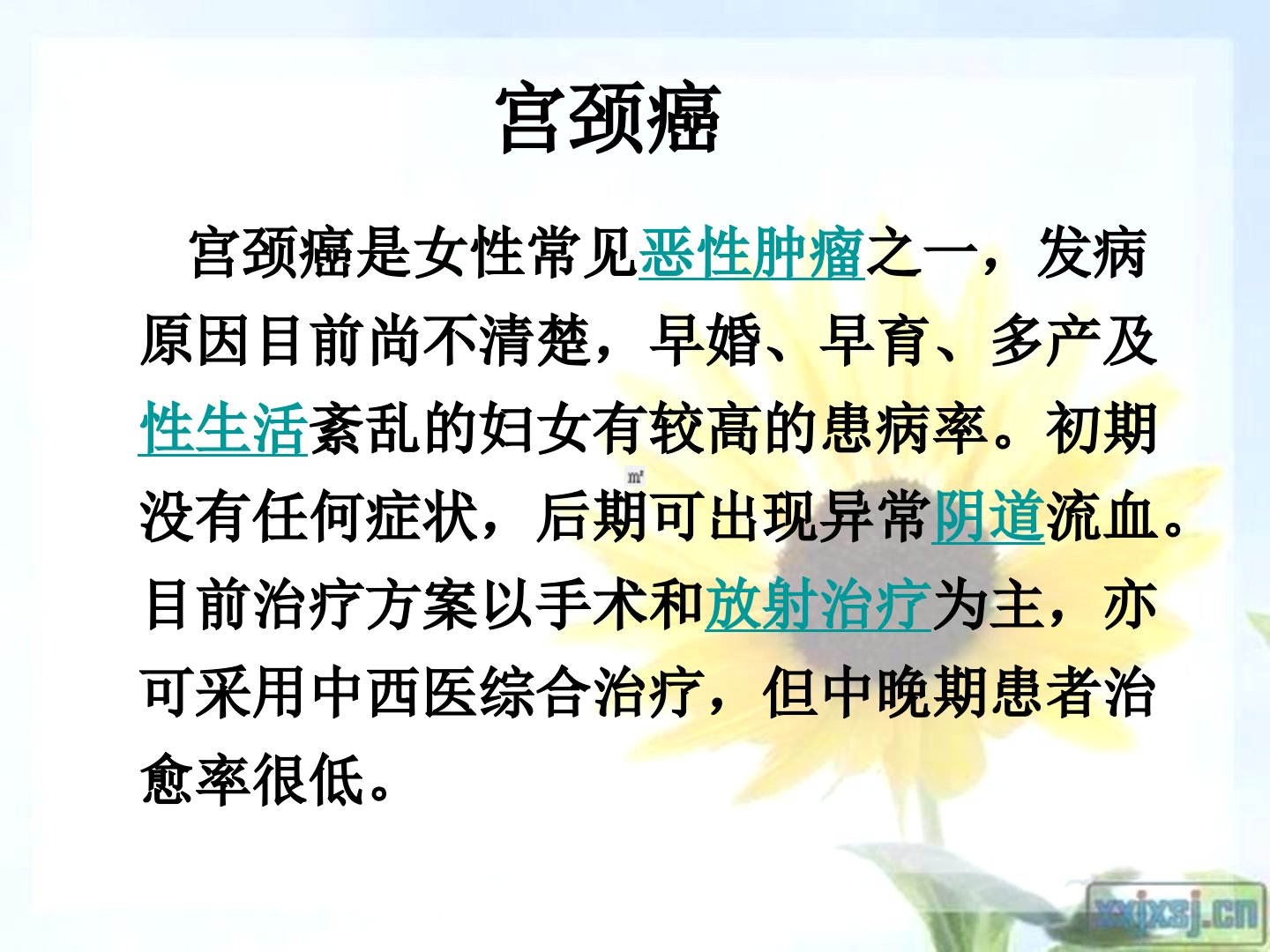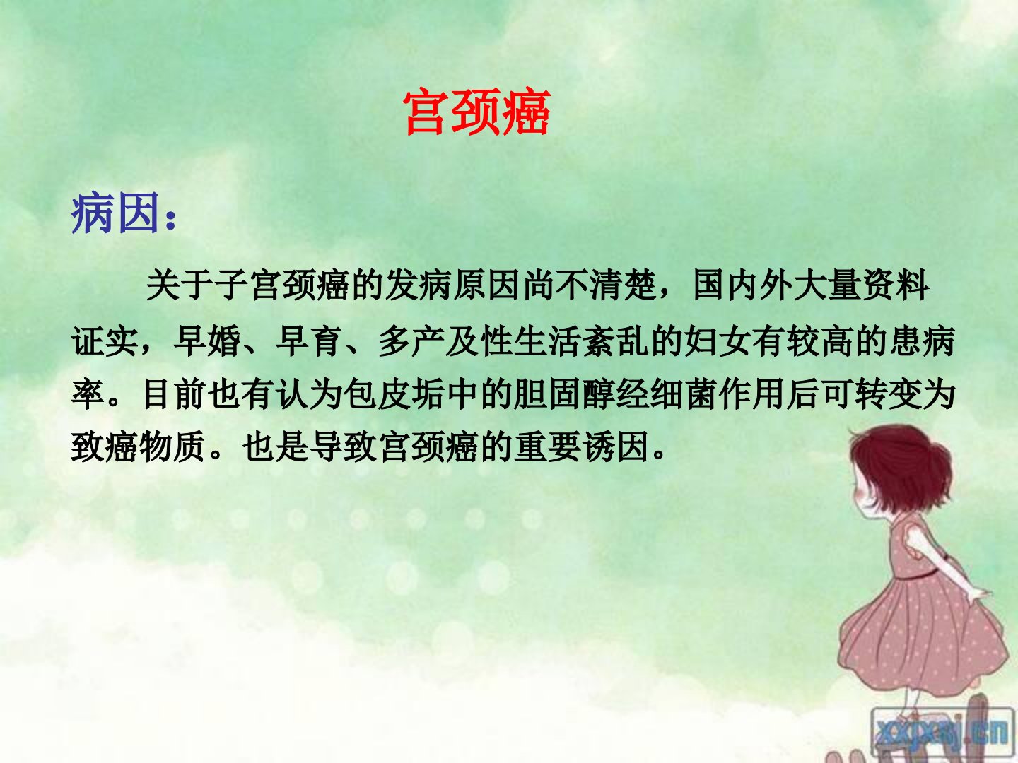 宫颈癌摘要宫颈癌是女性常见恶性肿瘤早婚、早育、多产、性生活紊乱的妇女患病率较高目前病因尚不清楚但与一些病毒有关如HSV2、HPV、CMV等。宫颈癌以鳞状上皮细胞癌为主占9095腺癌仅占510依病理切片癌细胞分化程度分三级。初期无症状后期可异常阴道流血早期多无症状与慢性宫颈炎区别不明显晚期根据病灶侵犯范围出现继发性症状。宫颈癌的诊断依赖病史、临床表现和系列检查。治疗方案包括手术、放射治疗及中西医综合治疗中晚期患者治愈率低。预防关键在于定期妇科检查早期发现和治疗癌前病变。术后护理包括心理支持、饮食调整、皮肤保护、阴道冲洗及并发症预防等多方面。