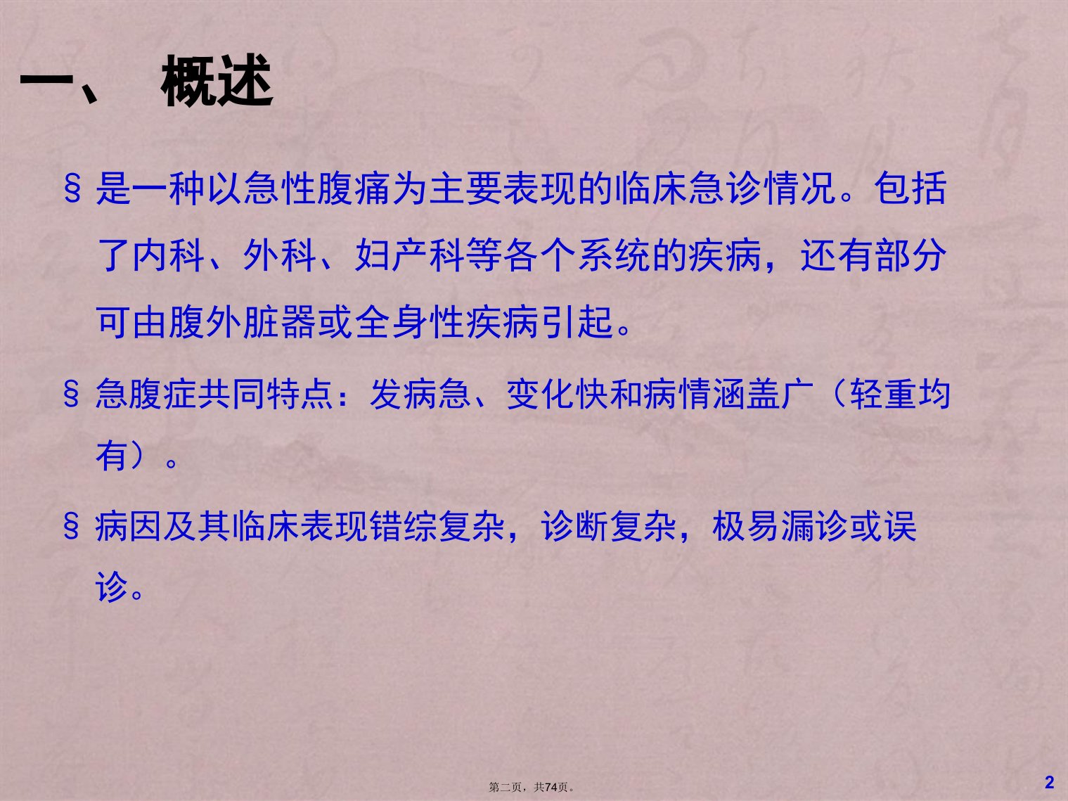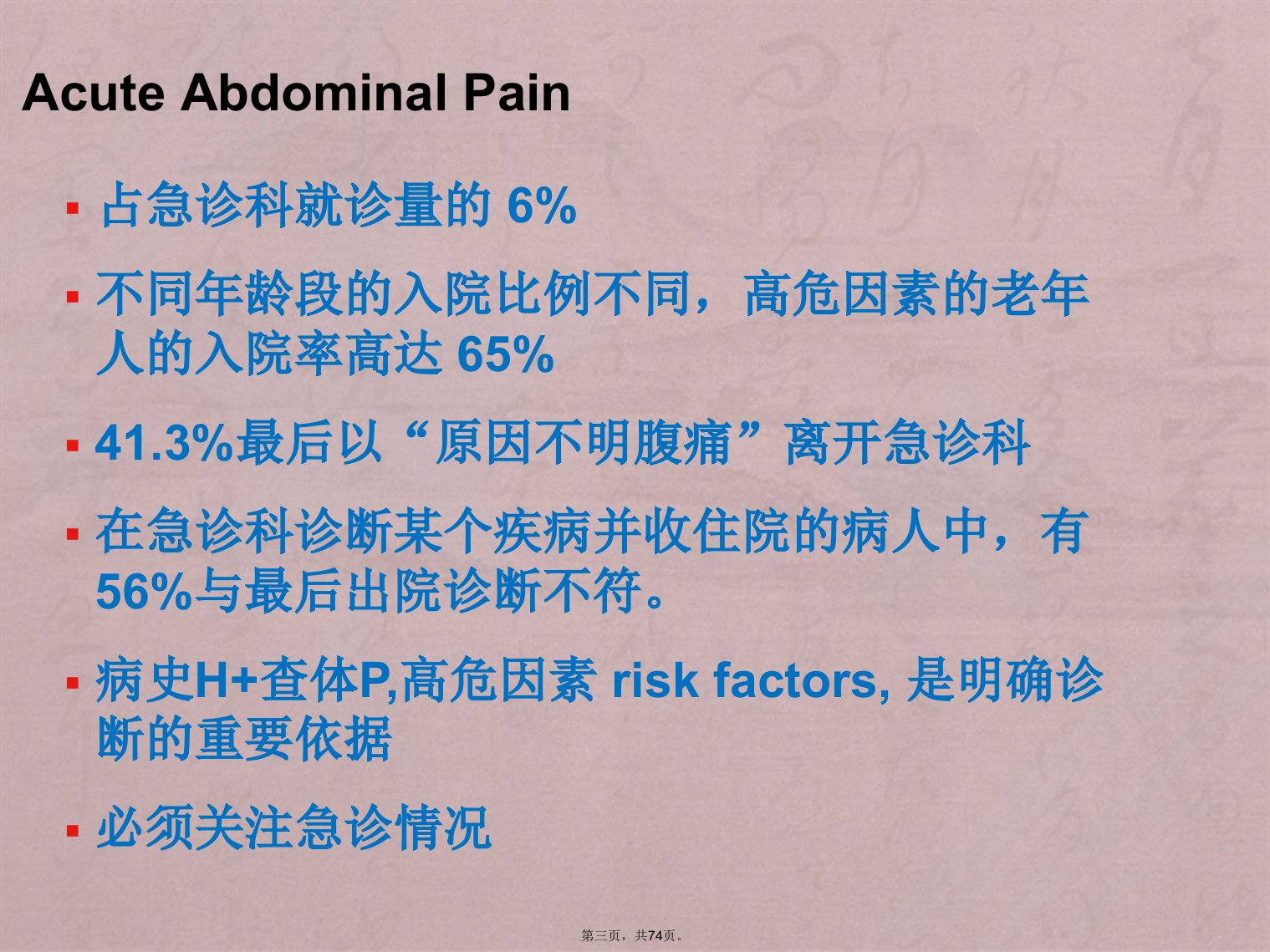 急腹症诊疗摘要急腹症以急性腹痛为主要表现涵盖内科、外科、妇产科等多系统疾病部分由腹外脏器或全身性疾病引发具有发病急、变化快、病情涵盖广的特点病因及临床表现错综复杂诊断时极易漏诊或误诊。病因与机制常见病理与病因包括炎症、穿孔、阻塞、扭转、溃疡及血管病变等腹外脏器及全身性疾病也可引发类似症状。评估与诊断诊治重点在于鉴别诊断需迅速、细致询问病史进行体格检查并选择性辅助检查综合分析确定病变部位、性质和病因。病史询问涵盖诱因、年龄与性别、部位、缓急轻重、性质、程度及放射痛等。查体包括全身评估、腹部检查及特殊体征检查。辅助检查包括实验室检查、心电图、X线、B超、诊断性腹腔穿刺或灌洗、CT、内窥镜及血管造影等。治疗原则始终坚持先救命再治病原则评估病情危重情况对一般轻症病人重点明确诊断后处理重症病人则需重症监测密切注意生命体征。根据诊断结果确定是否需要手术对于诊断不明的病人根据情况决定治疗方式。对于有明显细菌感染征象者合理使用抗生素诊断不明时在2000年ACEP指南支持下可安全使用止痛药。