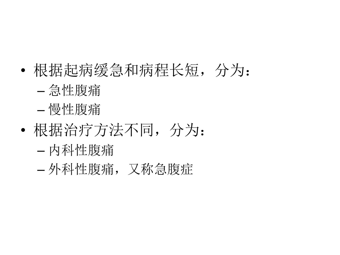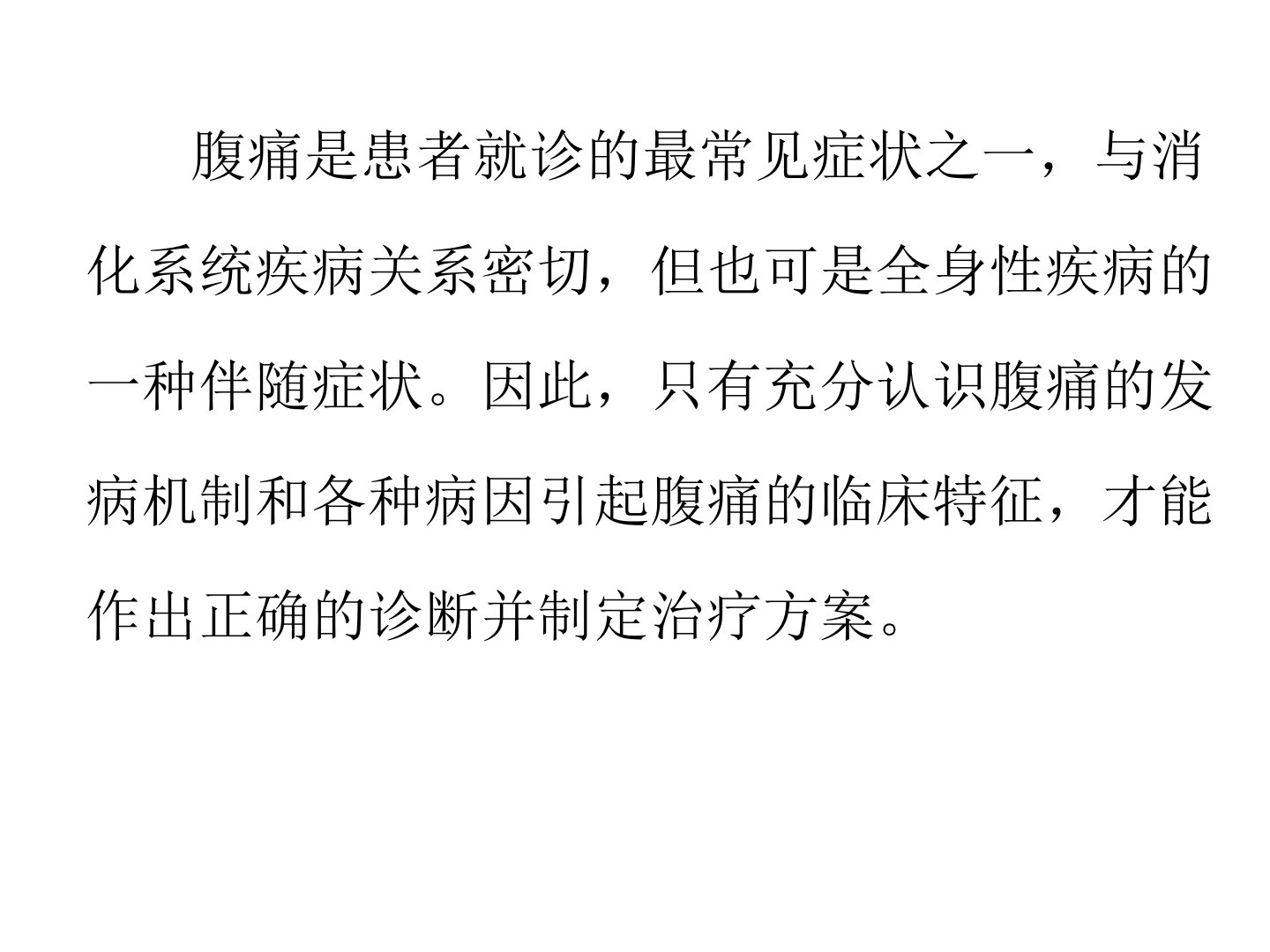 摘要腹痛是患者就诊的常见症状与消化系统疾病关系密切但也可是全身性疾病伴随症状。其分类多样根据起病缓急和病程长短分为急性和慢性腹痛;根据治疗方法不同分为内科性和外科性腹痛。腹痛由机械性和化学性因素引起通过A、C纤维传导不同神经传导会产生不同性质的疼痛包括内脏痛、躯体痛和放射痛。诊断腹痛需进行详细的病史收集了解疼痛部位、性质、规律、伴随症状等还需询问女性患者月经史等特殊情况。体格检查也很关键包括腹诊的视、听、叩、触等。同时要合理选择实验室检查与影像学检查。此外要区分内、外科腹痛特点掌握常见急腹症特征。诊断要以系统认识为主导依据病史等检查用分类和排除法警惕危重型急腹症重视动态观察。