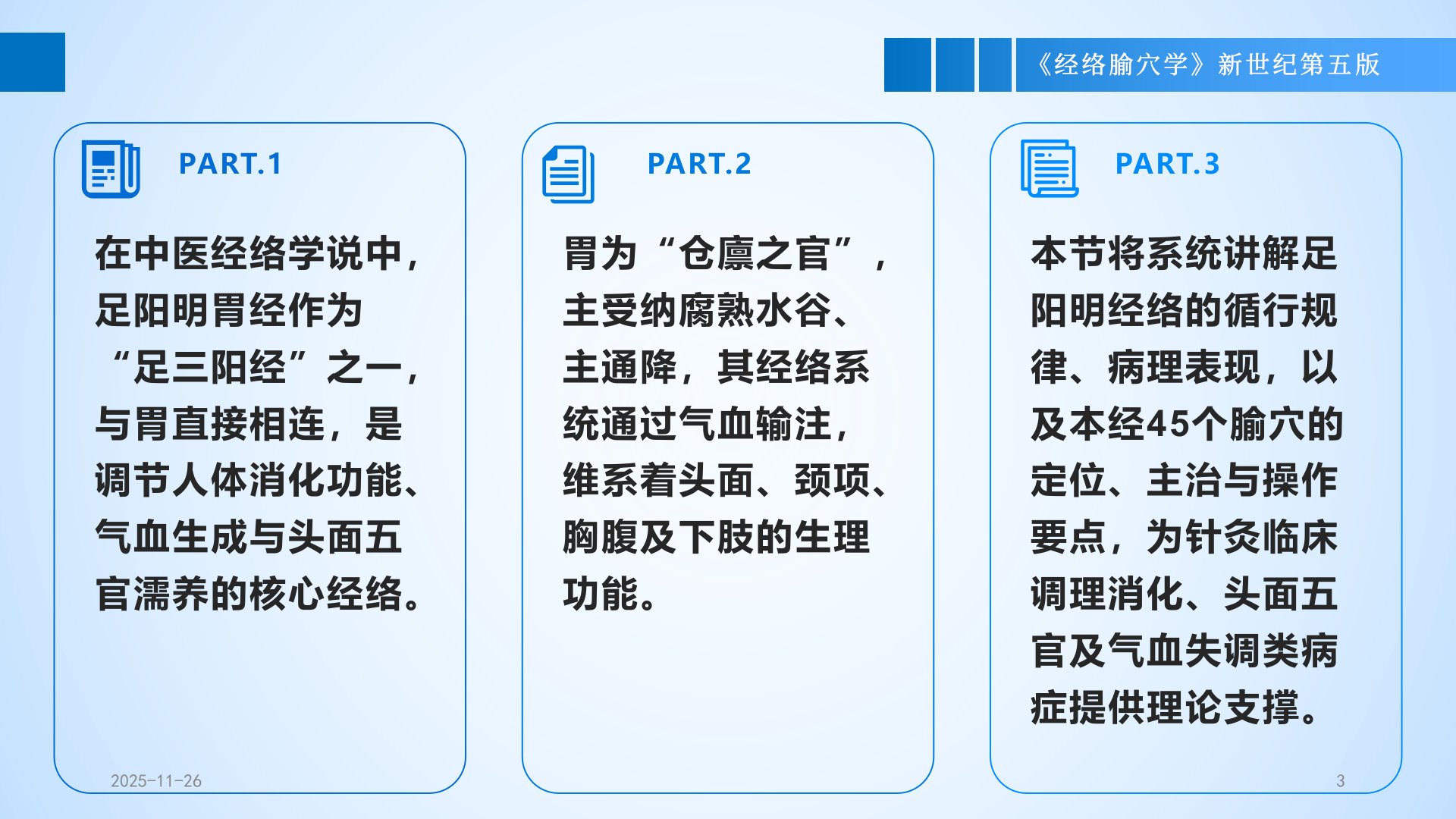 第五章足阳明经络与腧穴第一节导入与概述在中医经络学说中,足阳明胃经作为“足三阳经”之一,与胃直接相连,是调节人体消化功能、气血生成与头面五官濡养的核心经络。PART.1胃为“仓廪之官”,主受纳腐熟水谷、主通降,其经络系统通过气血输注,维系着头面、颈项、胸腹及下肢的生理功能。PART.2本节将系统讲解足阳明经络的循行规律、病理表现,以及本经45个腧穴的定位、主治与操作要点,为针灸临床调理消化、头面五官及气血失调类病症提供理论支撑。PART.3本节内容分为两大模块:足阳明经络与足阳明腧穴。其中,足阳明经络包括经脉、络脉、经别、经筋四部分,共同构成胃经气血运行的通路;足阳明腧穴起于内眼角的承泣穴,止...
